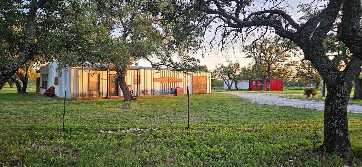 Relax with the family under the stars at this peaceful retreat. The barndominium offers one bedroom with two queen beds, a cozy living area, and a dedicated workspace. The updated bathroom features a new soaker tub for unwinding. A separate guest house adds privacy with a kitchenette and full bathroom. There are no permanent beds, but guests may bring air mattresses. Enjoy the large patio, charcoal grill, cornhole, board games, starry nights, and grazing deer—perfect for slowing dow