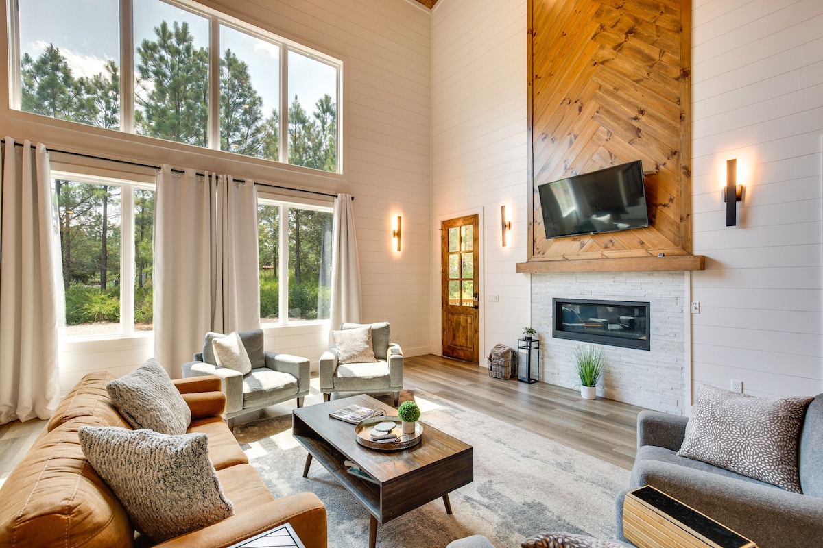 Welcome to Forestlight Lodge! A spacious farmhouse-style cabin located in the desirable Boulder Ridge development in newly developed Hochatown North. Vaulted ceilings, open-concept living, & towering walls of windows connect you to the beauty of the outdoors, this 3BR+2BA home has everything you need. Spend starry evenings sharing stories around the fire pit or enjoy your book while unwinding in the hot tub. Explore endless opportunities for entertainment & relaxation.