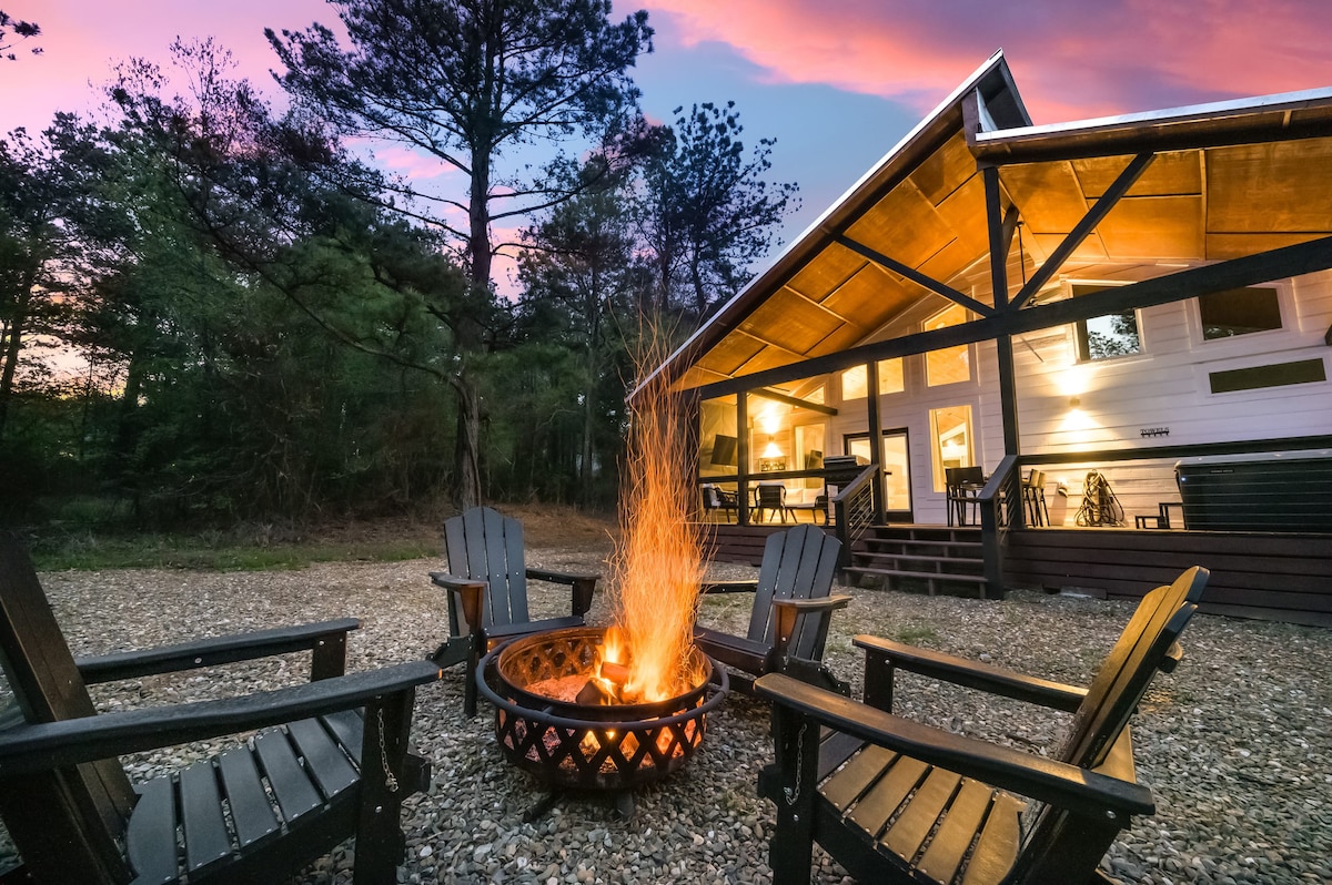 * Hot Tub * Swinging Daybed * Fire Pit * Swing Garden * Treetop Deck * EV Charger Escape to a modern romantic cabin near Beavers Bend State Park and Broken Bow Lake. This secluded gem offers a serene retreat amidst lush woods. Relax on the elevated treetop-style patio, complete with a custom swinging daybed. Enjoy the swing garden next to the outdoor fire pit, where swinging egg chairs invite cozy evenings by the fire.