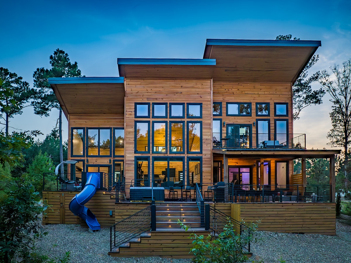 Porch + Pine is a luxury cabin only 5 minutes from the main hotspot of dining and shopping. It is nestled in a quiet, & exclusive high-end neighborhood. Relax on the large wrap-around deck or soak in the outdoor hot tub next to the fireplace. Cozy up next to the gas fireplace and watch your favorite show on the large HDTV. Prepare meals in the gorgeous custom kitchen outfitted with everything you could need. The bathroom is built like a 5-star spa, with a large soaker tub, & a walk-in shower.