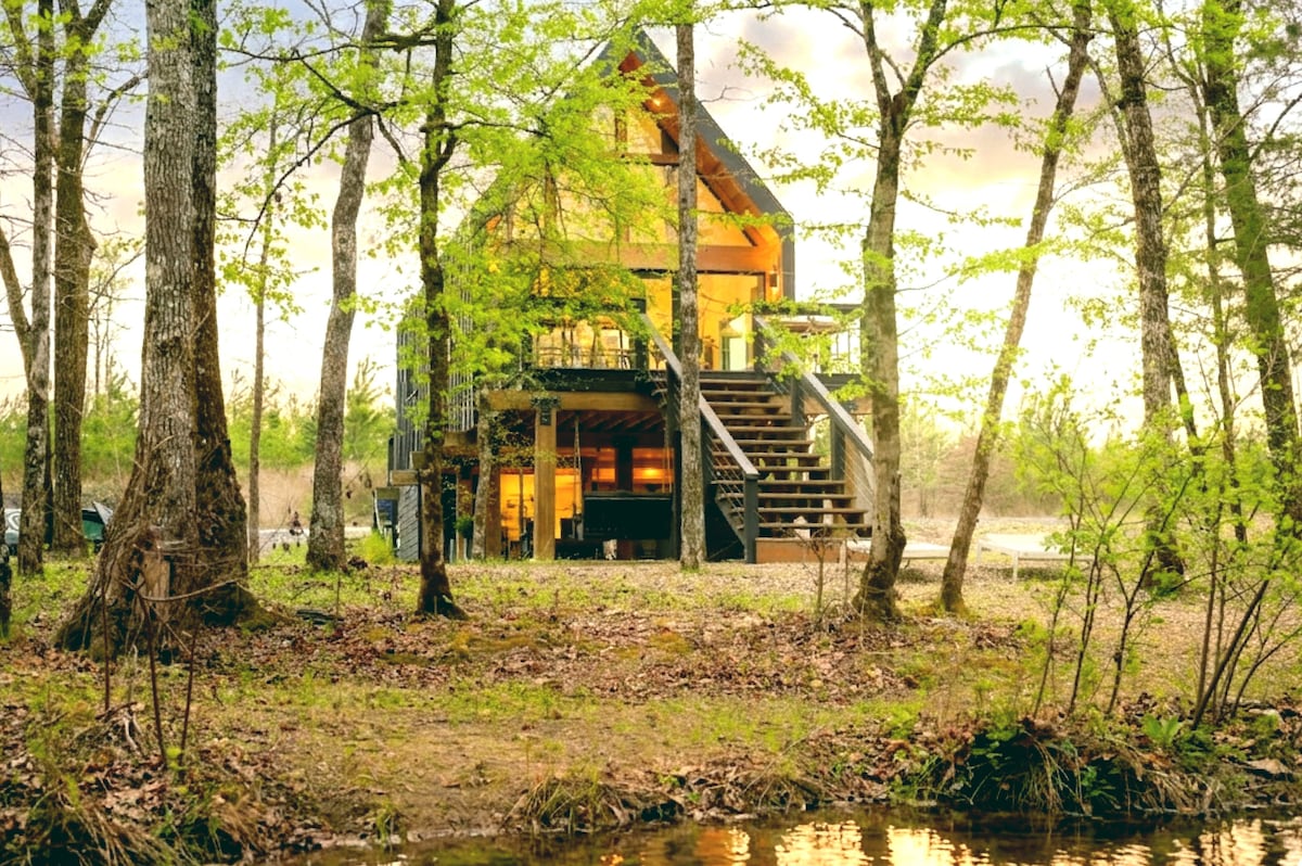 Welcome to Blushing Beaver, a romantic Scandinavian-style treehouse retreat for two. 🧖♀️ Nordic Barrel Sauna 🌊🌊 2 Creeks 🪢 Hanging Swing 🛁 Spa Bathroom w/ Dual Rainfall Showers 🔥 3 Fireplaces 💦 Hot Tub w/ Forest Views 🛏 Soaking Tub 🧖♀️ Robes 🧴 Beekman 1802 Luxury Toiletries ✭ "Romantic, peaceful, and still. Sitting on the side of a hill, looking into the trees. I would absolutely stay again. Website pictures are a true description"