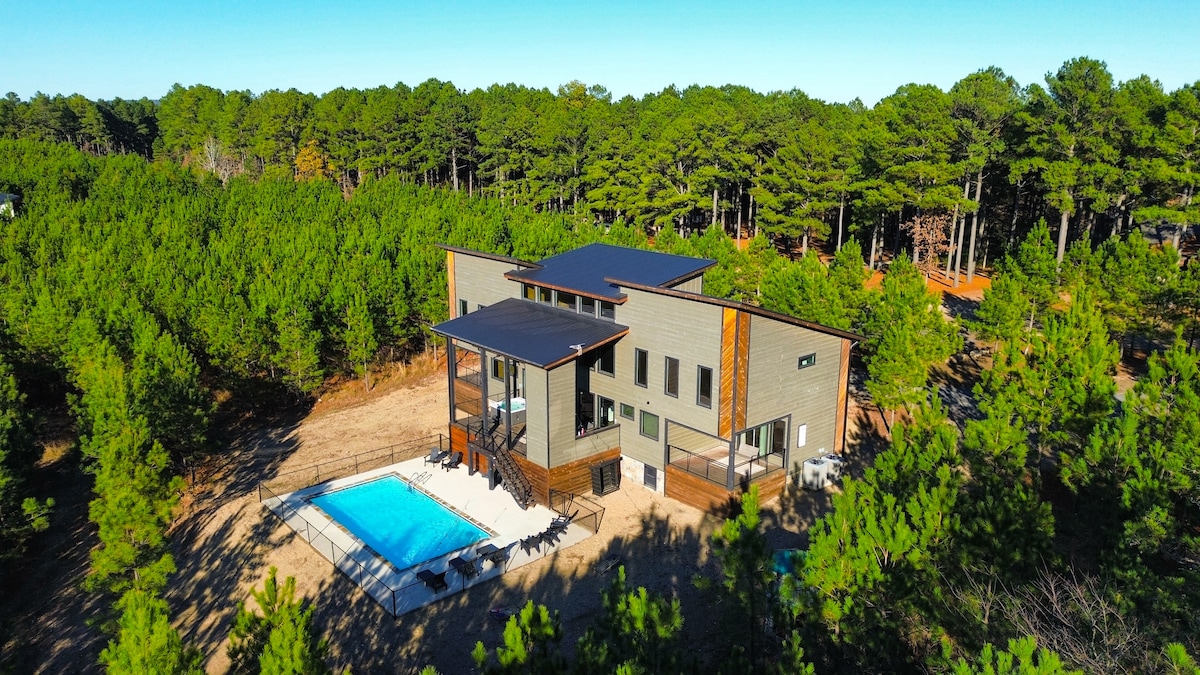 Strawberry Wine - a luxurious cabin with a contemporary flair. This custom build has artisan touches throughout the serene atmosphere. Nestled amongst 100 foot tall pine trees, yet only 1 mile away from award winning wineries, breweries and restaurants, Strawberry Wine is the perfect place to relax and unwind away from the hustle and bustle of everyday city life. We welcome you to our beautiful home and invite you to make precious memories in beautiful Broken Bow that last a lifetime.