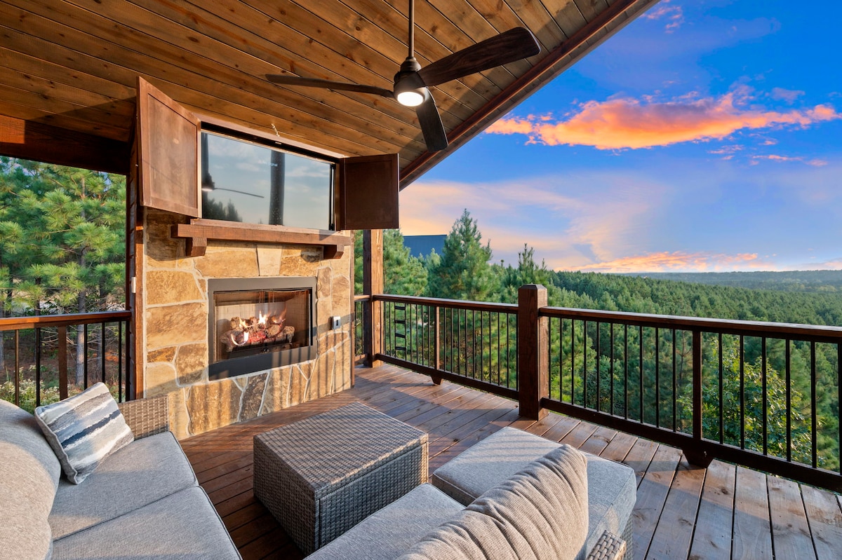 Your ideal retreat awaits at Timberline, a luxurious, professionally designed 4-bedroom, 3-bathroom cabin located in the forests of Broken Bow! Comfortably sleeping up to 12 guests, this expansive cabin boasts amazing sunset views, a private hot tub, fire pit, spiral slide + mini-rock wall for kids. Just 20 minutes from Broken Bow Lake, Mountain Fork River and Beavers Bend State Park, it's perfect for families and friends looking for a blend of sophistication, privacy and outdoor adventure.