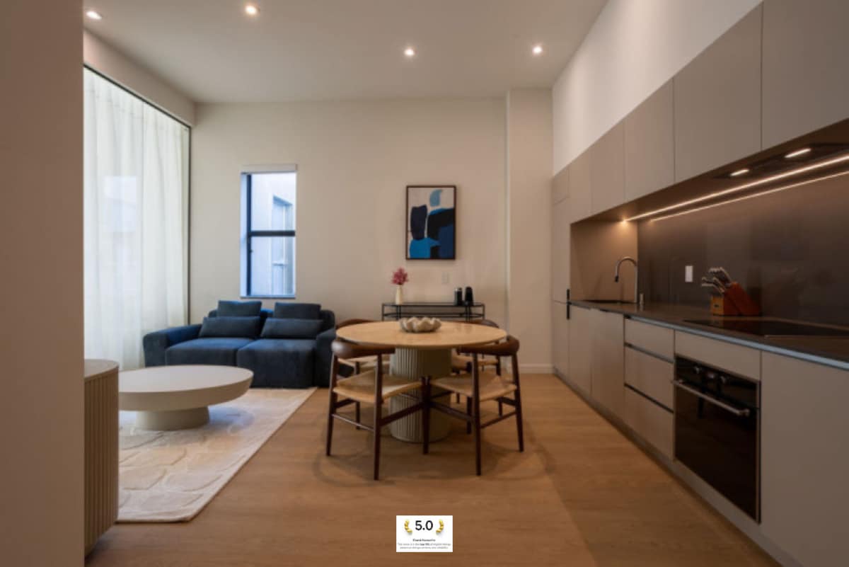 Where historic architecture meets modern design — welcome to Lambert. First built in 1874 and maintaining its original stone facade, this building fits seamlessly into Old Montréal. Each apartment includes in-suite laundry, a fully equipped kitchen, and a Roku TV. Wander the cobblestone streets toward Notre-Dame Basilica or Centre PHI. If you want cocktails and charcuterie-style bites, pop into our favorite late-night bar, Philemon. Make Montréal your own at Lambert.