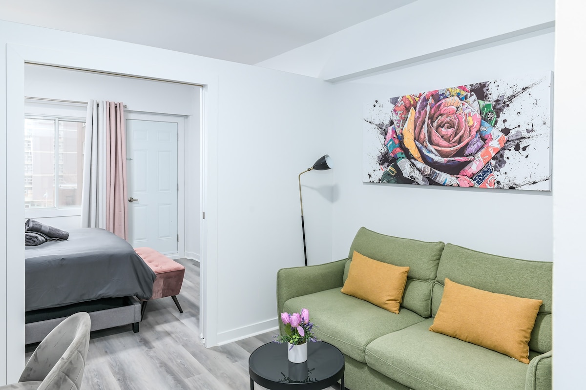 Step into a welcoming one-bedroom apartment designed for comfort and easy living. The space features a comfortable bedroom and a living room sofa bed, making it perfect for couples, friends, or small families visiting Montréal. Its inviting atmosphere and convenient location make it a guest favourite.