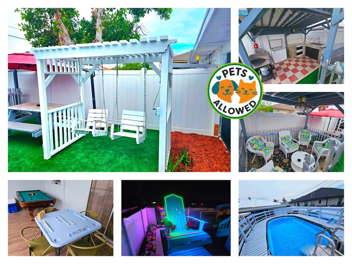 -5 min to Downtown Cape/10 min to Yacht Club Beach, 20 min to Causeway Beach, 25 min to Ft Myers & Sanibel Beach -Tropical fenced backyard w/ pool, hot tub, gas firepit, swing chair, hammock & Blackstone grill -Beach essentials, boogie boards, umbrellas, beach wagon, cooler & chairs -Board games, ping-pong, corn-hole, darts, 2 kayaks+life jackets -2 Beach Cruiser bikes + helmets -Relaxing enclosed covered patio + string lights, neon sign & grass wall -Canal access for kayak launch 5 min away