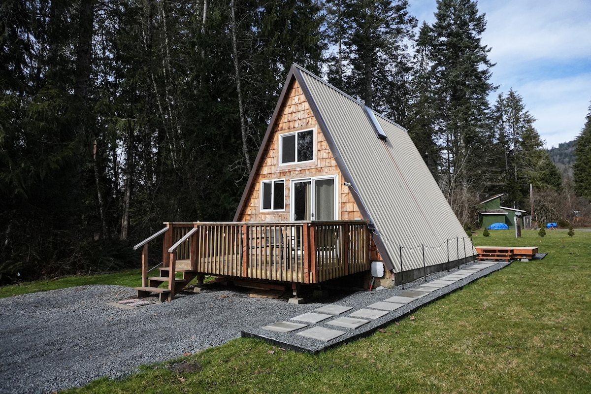 Located only 13 miles from Olympia WA this cottage combines artistic finishes and the rustic charm of its forest surroundings. Inside, there is a one-of-a-kind log staircase to your queen loft bed or enjoy the premium sleeper downstairs. There is a fully equipped kitchen including a wine fridge. The bathroom includes a unique LED lighted rain shower and don’t forget to take a dip in the outdoor tub. This is a true piece of paradise just for you.
