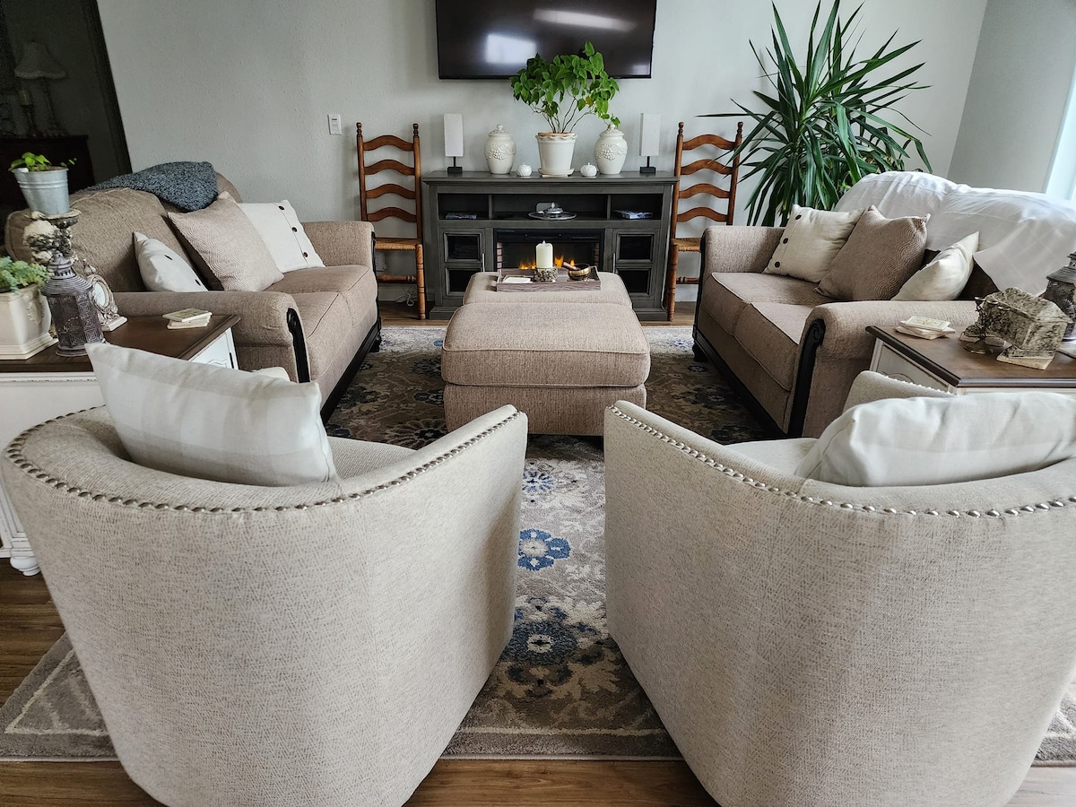 This bright 770 sq ft suite consists of the entire upstairs of my home with two spacious bedrooms with queen beds, a large family room with a queen sofa bed, and bathroom with double sinks and tub/shower. There is no kitchen, but includes an apartment size fridge, microwave, coffee maker, instant pot, and convection oven/air fryer. I provide breakfast (yogurt, fruit, granola, cereal, coffee, tea, cream). Guests enter through the shared front door of the house, and head upstairs to the suite.