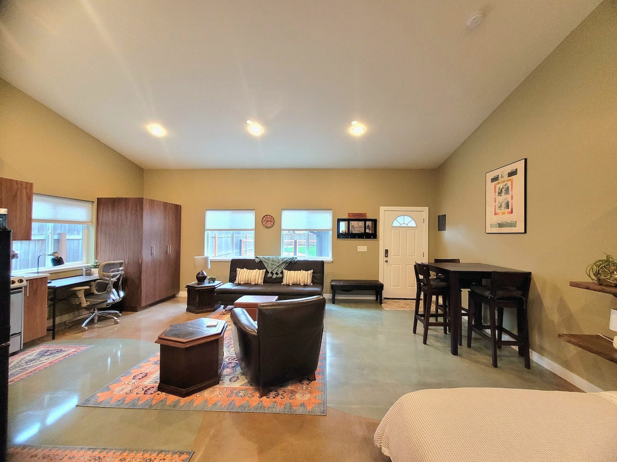 We are located in the South Hills of Eugene. Close to U of O with easy driving access to amenities. The garage guest house sits on 3 wooded acres w/ south views to Creswell and winter views of the Three Sisters to the east. Built in 2020, the studio features a large walk-in shower, full kitchen, and laundry amenities. Sleeps 6 (King, double sleeper sofa, and two twins) Parking for multiple cars if needed. Unwind in a peaceful, natural Oregon setting, we look forward to hosting you.