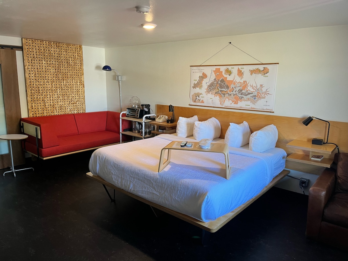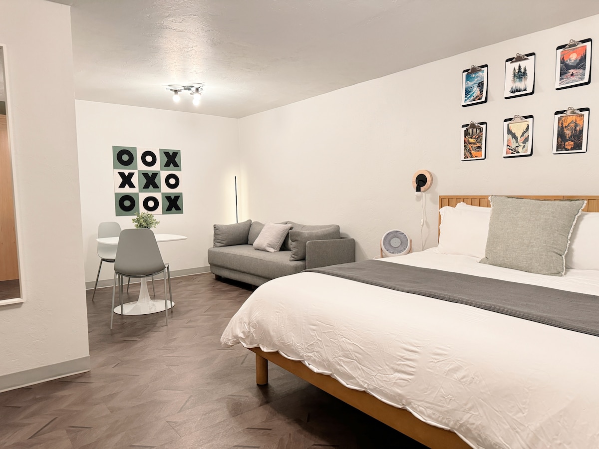 Our largest room layout. Featuring one King bed, plus a Queen memory foam sofa bed, HD 55” TV w/streaming and a private bathroom with a tiled step-in shower. Custom white oak coffee station w/Keurig, coffee pods, microwave and mini-fridge with freezer. New AC/heat unit, plush mattress, soft linens and our luxury bath amenities. Dining table seats 4. Built-in white oak laptop desk station w/hi-speed wi-fi.
