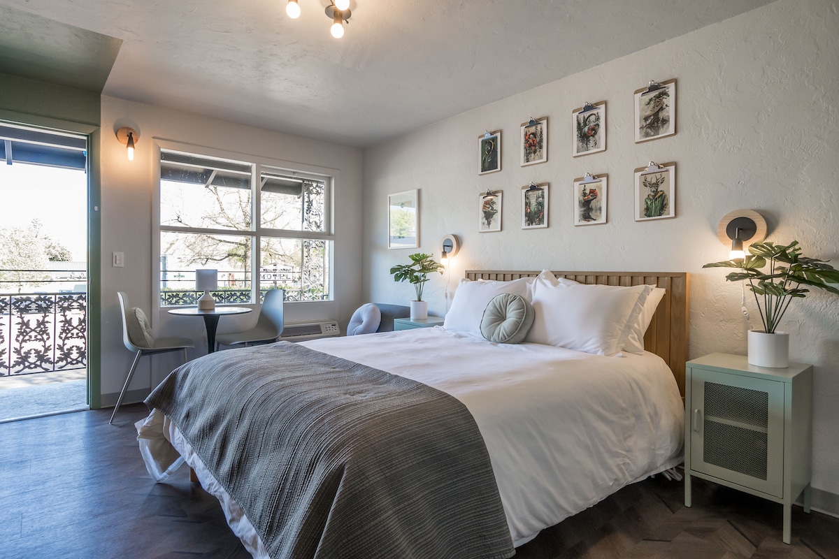 One King bed, 55” TV w/streaming and a private bathroom with a tiled step-in shower. Custom white oak coffee station w/Keurig, coffee pods, microwave and mini-fridge with freezer. New AC/heat unit, plush mattress, soft linens and our luxury bath amenities. Built-in white oak laptop desk station w/hi-speed wi-fi. Dining table for 2 and designer sofa seat.