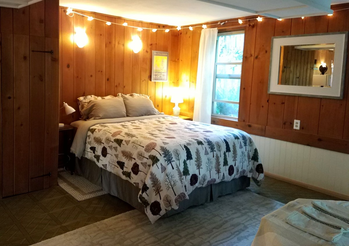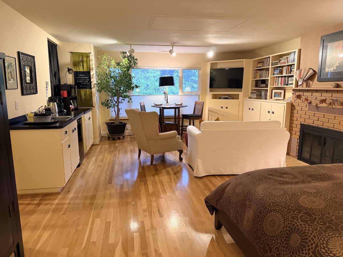 You'll feel like you're in a nest in the trees while staying in this freshly remodeled studio adjoining our personal home in South Eugene. Near town and close to all the necessary amenities, you'll still feel tucked away and in your own little retreat spot. With a full kitchen at your disposal, you'll be able to stop by any of the local farmer's markets and come home to make a beautiful fresh meal. If working from home is your thing, we've got fast wifi and a perfect spot to focus in.