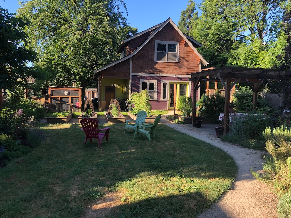 Nature lovers feel at home in my cozy cabin that is one mile from the U of O, Hayward Field, Matthew Knight Arena & adjacent to Hendricks Park - world famous Rhododendron garden w/ wild trails for running, walking & manicured gardens for strolling & picnics. My space is peaceful (no tv), comfy & practical. Queen bed with cotton sheets, coffee & tea on the kitchen shelf, outfitted for simple meal prep. Enjoy the outdoor deck & glider swing as wild deer & birds visit. You are welcome here!