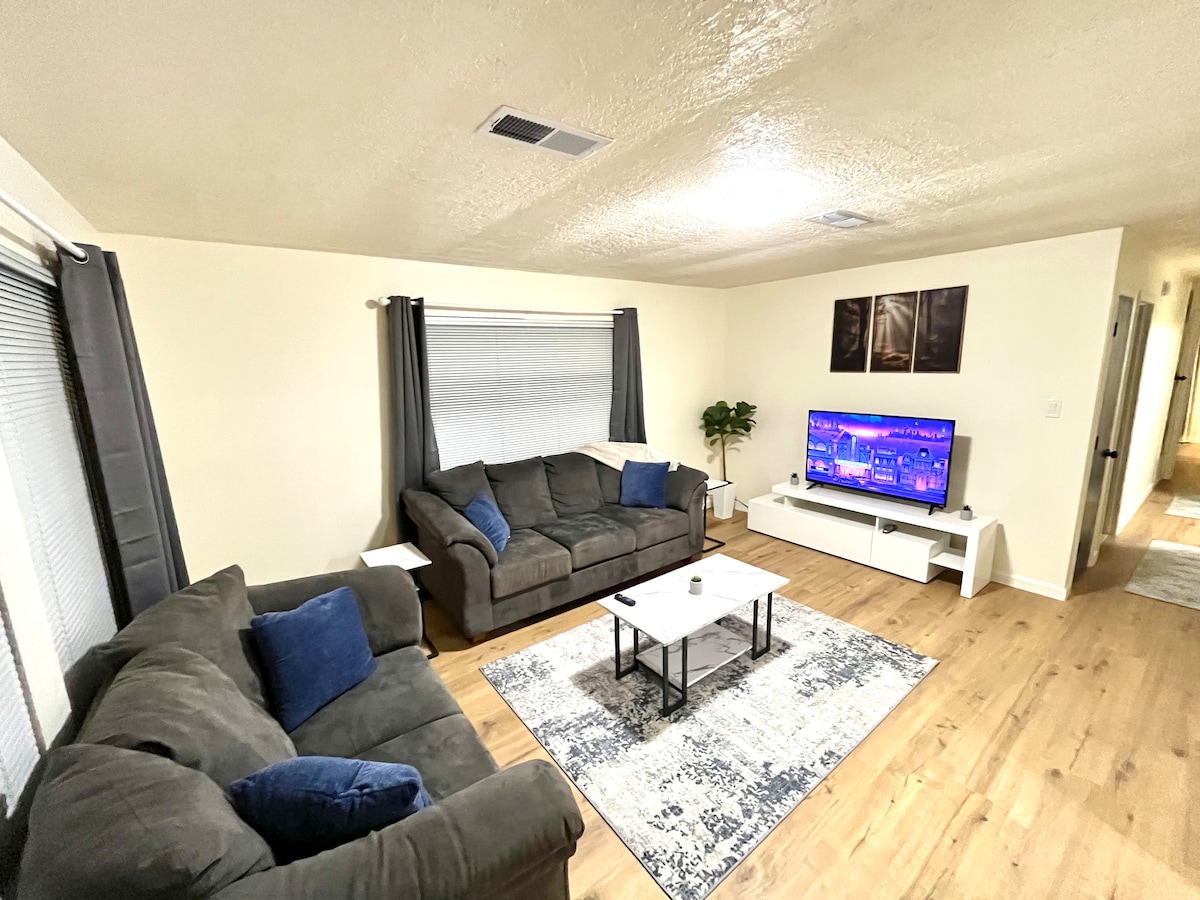 Welcome to your quiet home away from home! This updated 3BR, 2BA retreat comfortably sleeps 6 and features fast Wi-Fi, a fully equipped kitchen, smart TV, and off-street parking. Families will love the kid-friendly layout and private covered patio for relaxing evenings. Located in a peaceful neighborhood with easy access to I-40 and top local restaurants just minutes away. Ideal for families or professionals looking for comfort, convenience, and great value.