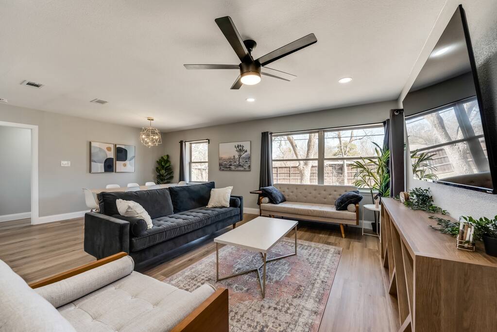Nestled just minutes from historic Downtown McKinney, this fully renovated 4-bedroom, 3-bathroom, pet-friendly home blends modern comfort with small-town charm. Updated in 2022, it features a fully stocked kitchen with new appliances, a king suite with workspace and Smart TV, and three additional queen bedrooms. Relax by the fire pit or grill in the tree-shaded backyard—perfect for families, friends, or furry companions. 3 mins to Downtown McKinney 2 mins to US-75/Central Expressway