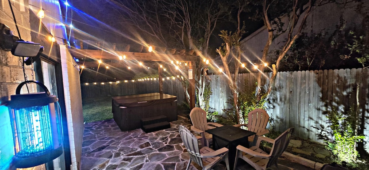Experience this unique gem, located inThe Colony near Lewisville Lake, Hawaiian Waters , Grandscape, PGA and lots of restaurants. This 3 bedroom home is comfortable and uniquely designed for indoor outdoor fun and relaxation. The kitchen is stocked with essential cooking tools, soft drinks, snacks and Keurig. Enjoy the beautiful backyard with outdoor games, grilling, and dining under the lighted pavilion. Immerse yourself in the temp controlled 6 person Hottub or relax in the outdoor lounge.