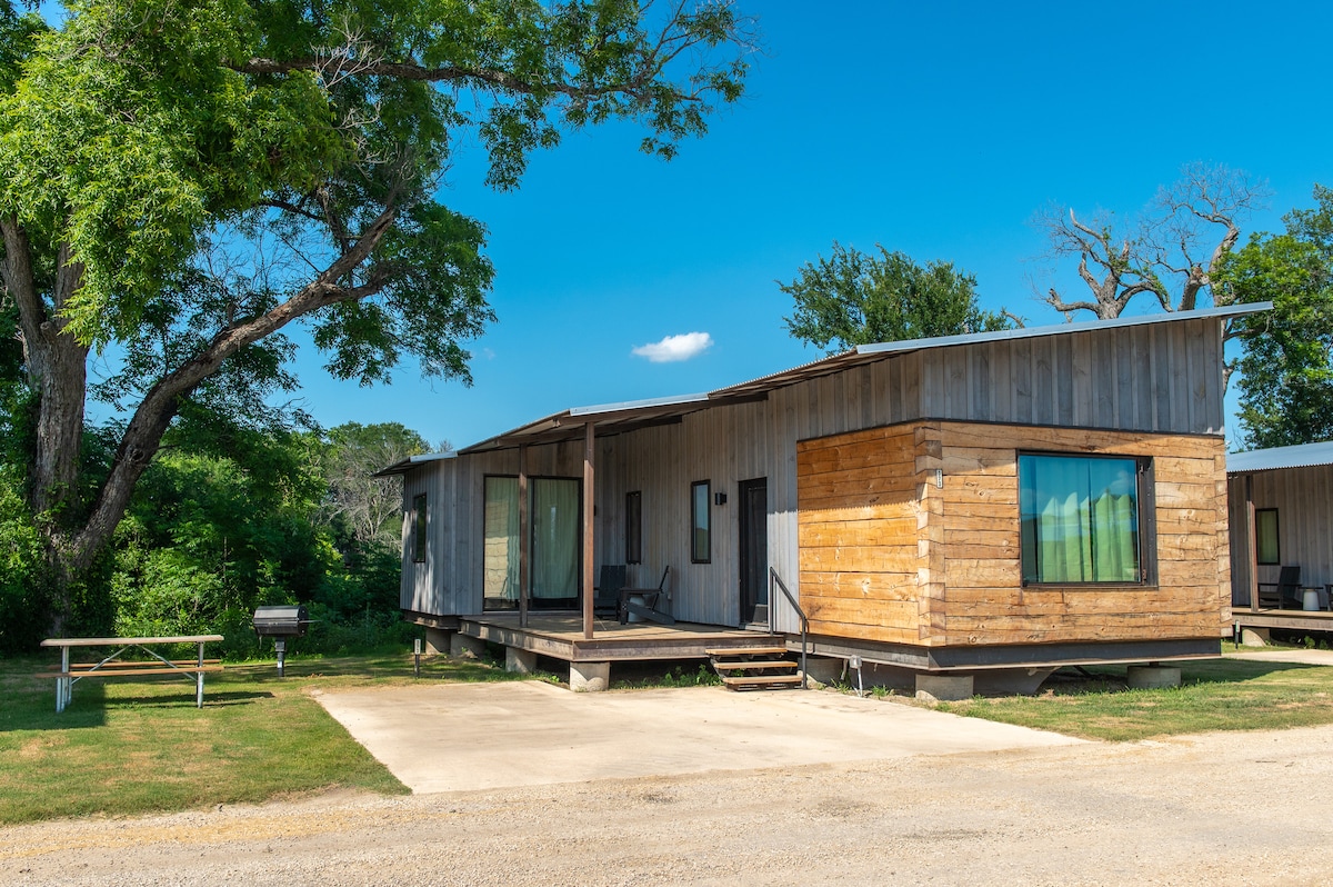 Enjoy our rustic cabin on the beautiful Brazos River. Our cabin is one large room with a queen bed and a queen sleeper sofa. Grain silos have been converted to awesome restroom and shower facilities. Outside area includes a covered deck as well as an open deck. Charcoal grill available for outdoor cooking. Large fire pit for relaxing by the fire! Full access to the river for fishing and swimming. 18 miles to Baylor Stadium and Magnolia Market at the Silo! Come enjoy the Big Rocks on the Brazos!