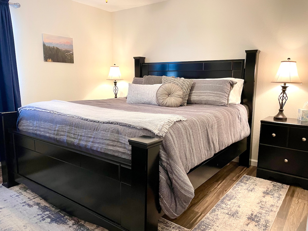 With the attractive Dutch architectural lines and Santa Fe-style stucco exterior, wood trimmed interior, 10’ ceilings and custom made furniture, you’ll hardly believe you’re in a tiny house. One master bedroom with a king-size bed and a comfortable floor mattress allows up to four guests to sleep here. Full-size bathtub and luxurious walk-in shower, along with a kitchenette, dining room and more make this your perfect “home away from home.”