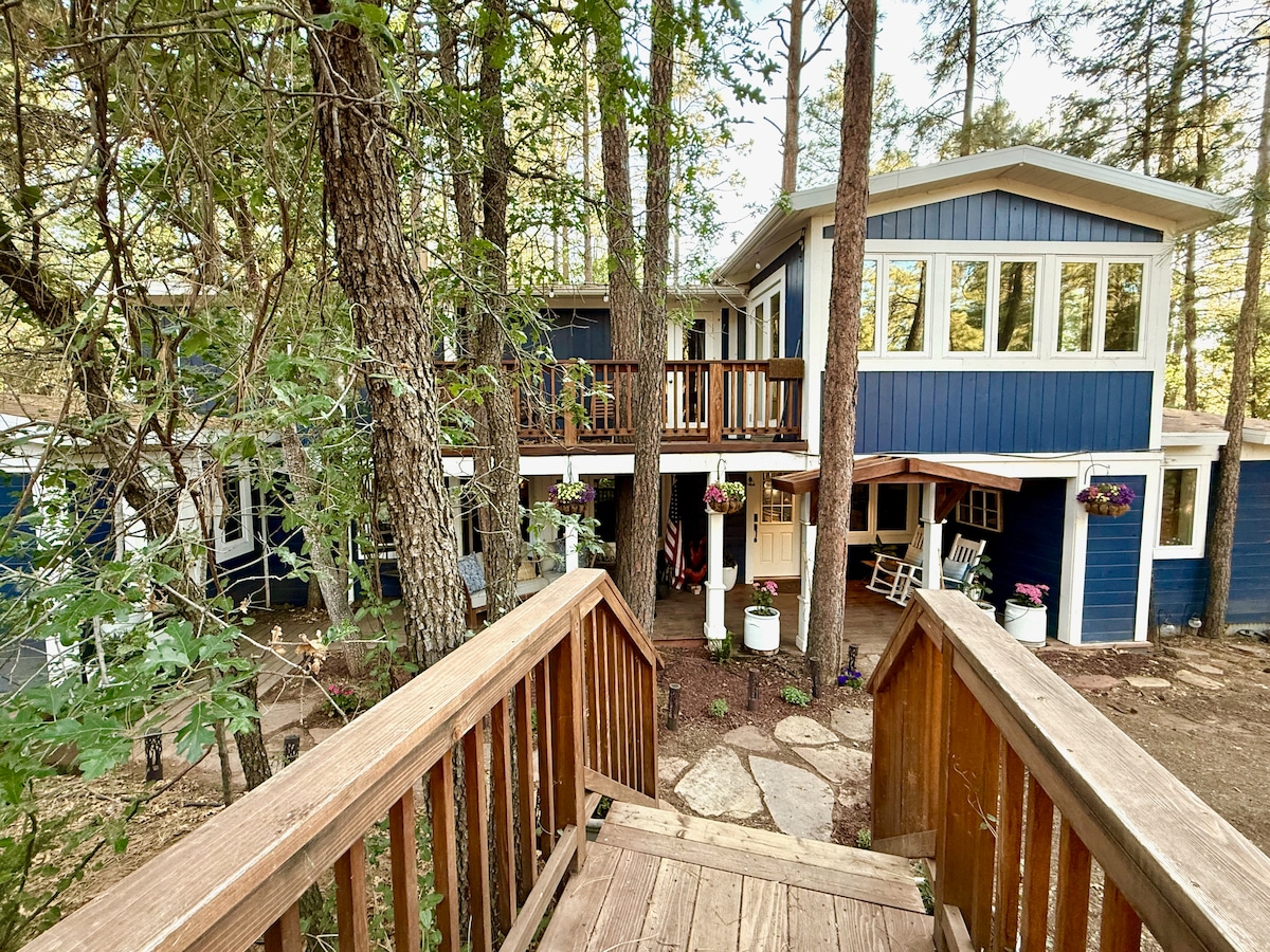 Welcome to your forest hideaway — where East Coast charm collides beautifully with Arizona’s iconic pines. This once 1950s summer home has been lovingly expanded and reimagined while still honoring the soul of the original structure. The Blue Bungalow offers a warm, rustic blend of upscale touches, topline amenities and cozy spaces perfectly designed for connection. It comfortably sleeps up to 12 and features 6 decks, a cedar sauna bath, a private gym, a library, premium bedding and 2 fridges.