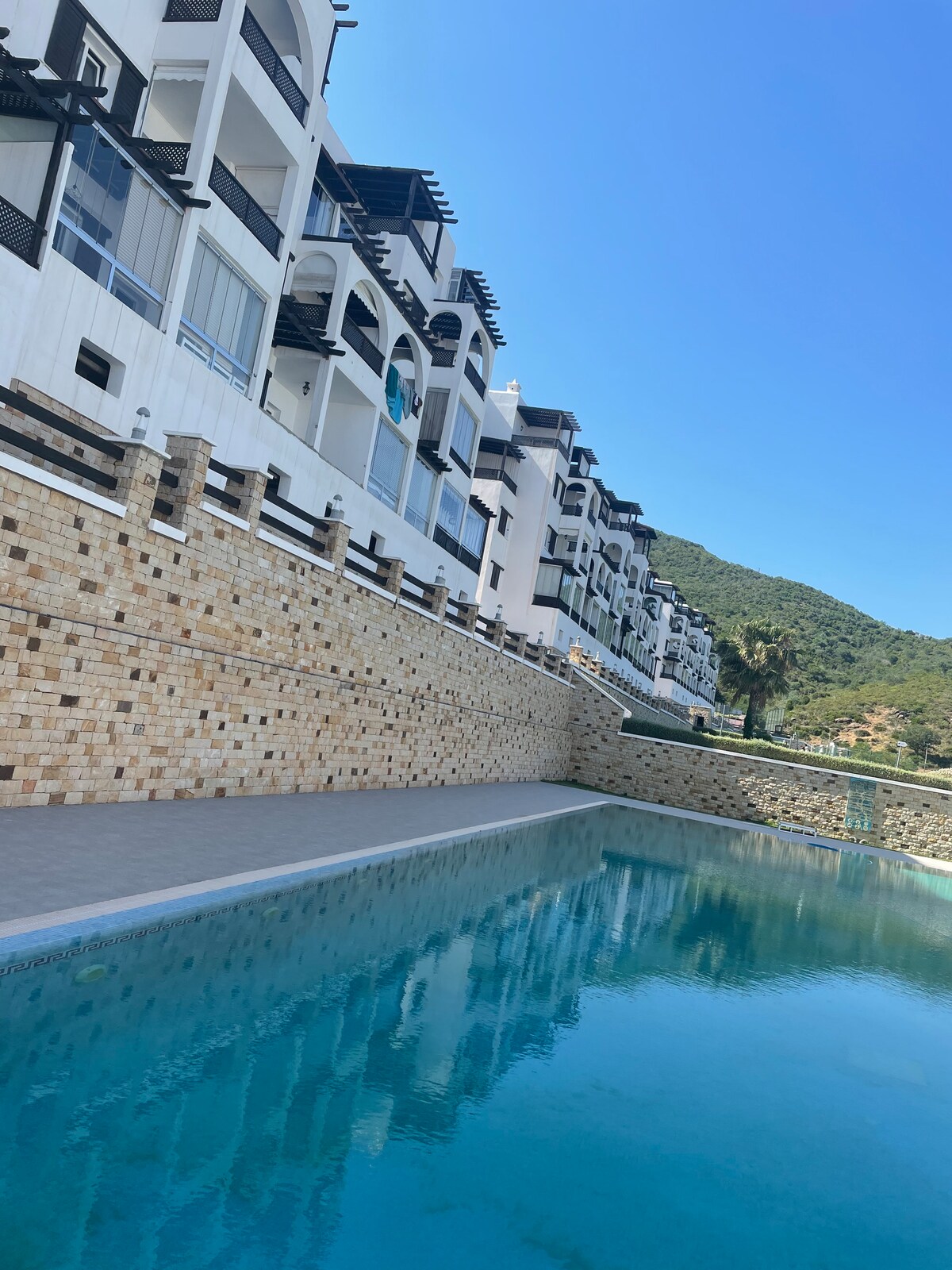 Amazing 3 bed apartment with all mod cons fully furnished with access to 7 great pools, outside gym, children's playing area, private parking 24hr security fully secluded, free wifi, this apartment comes with stunning mountain views, walking distance to the beach, this apartment is located in the north of Morocco.