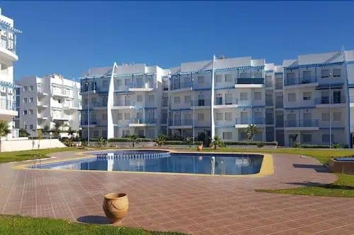 Je met en location un charmant appartement dans un complexe touristique BELLA VISTA à CABO NEGRO. Complexe sécurisé avec 14 piscines, Espace de jeux pour enfants, terrain de sport, supérette, Parking gratuit sur place, Plage à 8 min à pied, wifi . .. Appartement au RDC de 60 mètres carrés composé d'un salon, chambre à coucher, cuisine entièrement équipée, terrasse qui donne sur le jardin, climatisation centralisée, parabole collectif,... complexe réservé uniquement aux familles et couples marié
