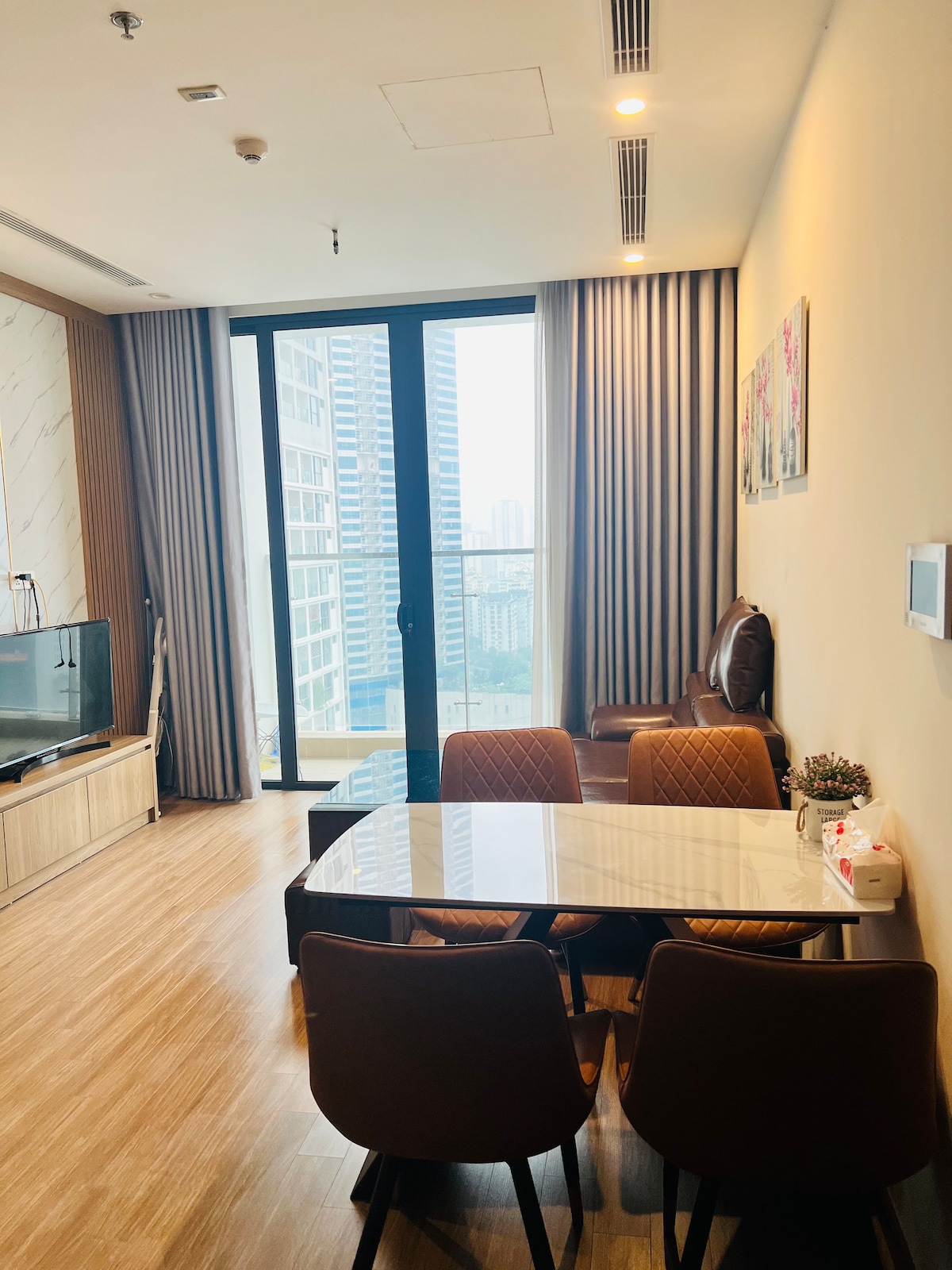 빈홈 스카이레이크 감성 가득한 럭셔리 1BR 아파트 하노이의 역동적인 도심 풍경을 한눈에 담을 수 있는 빈홈 스카이레이크 고층 아파트에 오신 것을 환영합니다. 탁 트인 시티뷰와 함께 현대적인 인테리어가 어우러져 여행객과 비즈니스 출장객 모두에게 완벽한 휴식을 선사합니다. [주요 특징] 환상적인 고층 전망: 거실 베란다에서 바라보는 하노이의 화려한 야경은 이 숙소의 가장 큰 매력입니다. 높은 층수 덕분에 도심의 소음에서 벗어나 조용하고 여유로운 시간을 보낼 수 있습니다. 비즈니스 최적화: 300Mbps 초고속 광랜 와이파이가 설치되어 있어 재택근무나 화상 회의에 최적화되어 있습니다. 최고의 위치: 경남 랜드마크 72(Keangnam)와 인접해 있으며, 미딩(My Dinh) 한인타운과 매우 가까워 한국 식당 및 편의시설 이용이 매우 편리합니다. 풀 옵션 편의 시설: 세탁기, 주방 조리 도구, 스마트 TV, 고급 침구류가 완비되어 있어 장기 투숙에도 불편함이 없습니다.