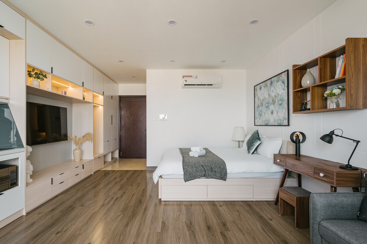 The apartment is located in the high-class apartment complex Vinhomes Greenbay Me Tri, 400 Luong The Vinh, Nam Tu Liem, Hanoi. The location is very close to the national administrative center, Grand Plaza, Korean Embassy, My Dinh Stadium,... The usable area of the Studio is 30 m2, including 1 bathroom, 1 double bed. , kitchen with refrigerator, induction cooker, microwave.. Besides, there is swimming pool, gym, playground for children. Therefore, you will feel very peaceful, safe and comfortab