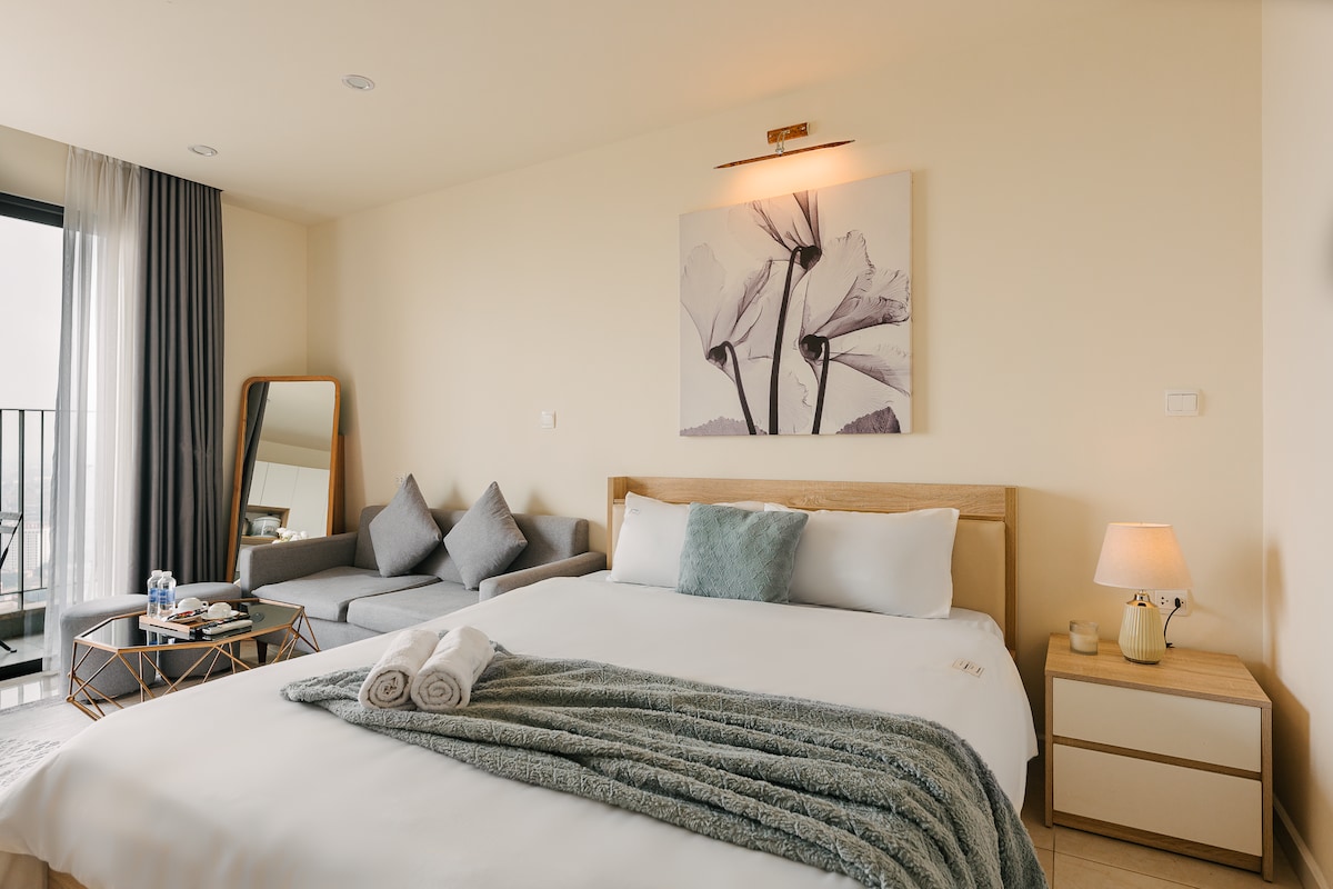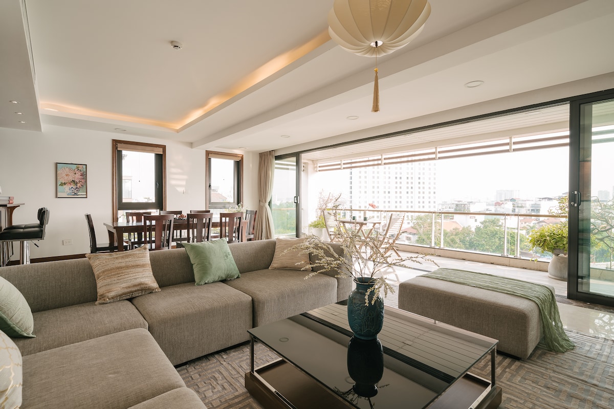 The apartment just opened in June 2025. It is meticulously designed in a mid-century style blended with Vietnamese cultural elements. Most importantly, it’s located right in Hoan Kiem District—just a 5-minute walk to the famous Train Street coffee check-in spot and another 5 minutes to Hanoi’s Old Quarter. Enjoy a stylish experience at this centrally-located place.