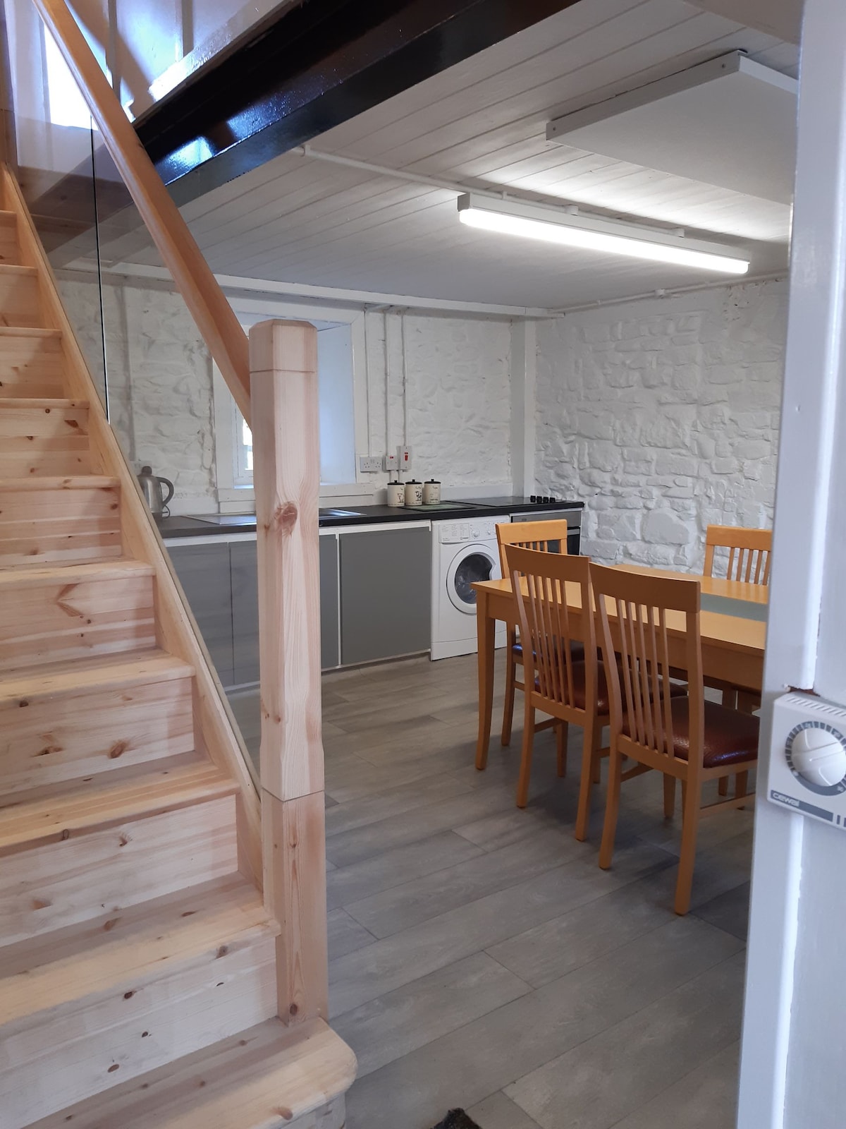 This is recent modern Barn conversion. (Jan 2015) It contains one large kitchen/dining/lounge area, one double bedroom with en suite facilities. June 2017 added second Living Space area with view of adjacent farm and wood, Lobby area with Laundry facilities and a second bathroom. Please note the Grounds and external outdoor perimeter of The Barn is protected by CCTV TK Alarm Company. Please know this is a simple place. It once was out buildings, however you will find it warm and homely.