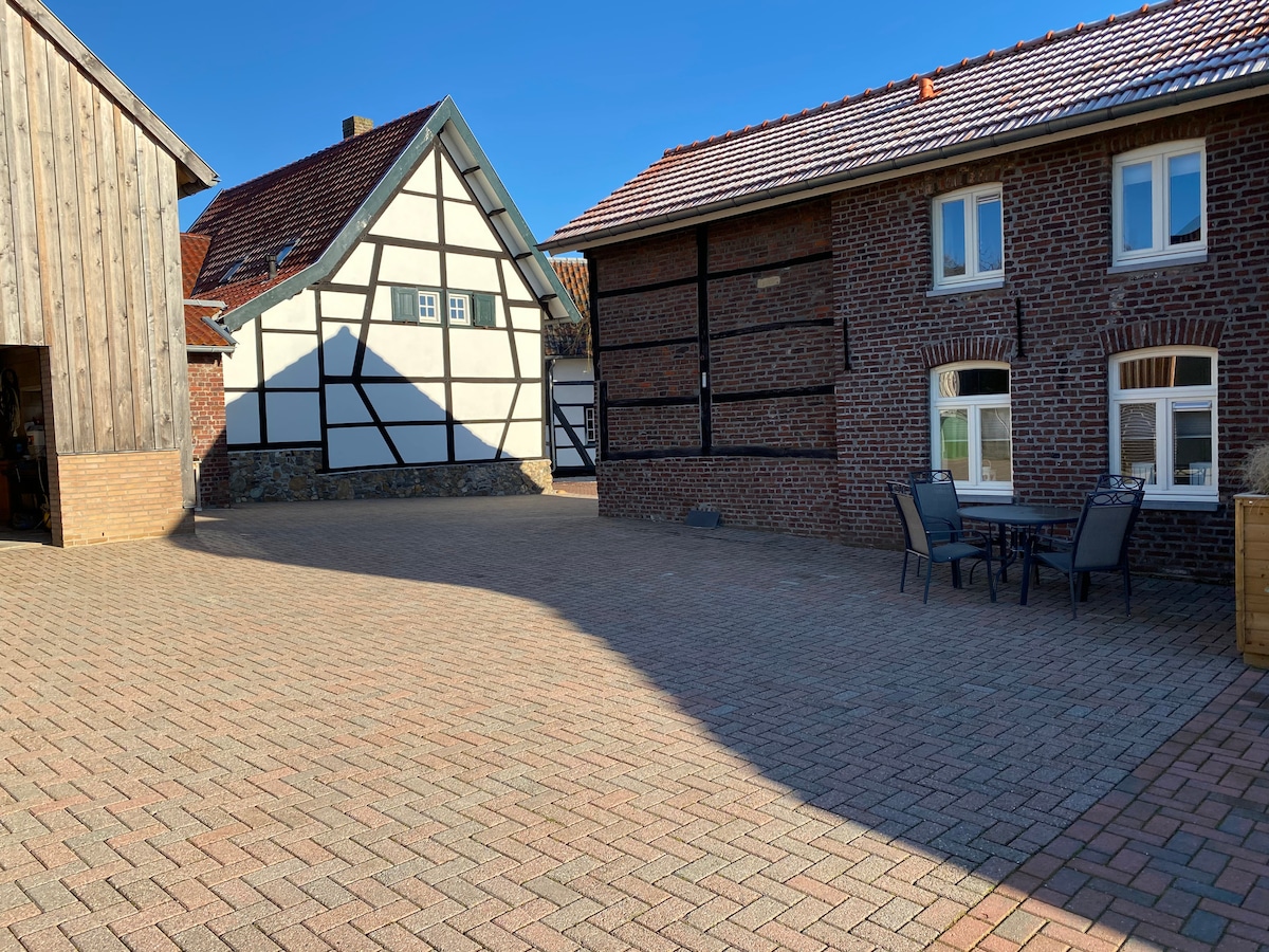 Die Wohnung befindet sich in der 1. Etage und ist über eine Aussentreppe erreichbar. Hier befindet sich auch eine kleine Terasse, die genutzt werden kann. Die Wände innen sind mit Lehmstreichputz verputzt, der Fußboden mit Dielenbretter ausgelegt. Die Wohnung liegt in einer ruhigen Nebenstraße. Öffentliche Verkehrsmittel (Bus und Bahn) sind in unmittelbarer Nähe. Eine regelmäßige Verbindung nach Aachen, Herzogenrath oder die Niederlande ist in 10-15 Min. Fußweg zu erreichen.