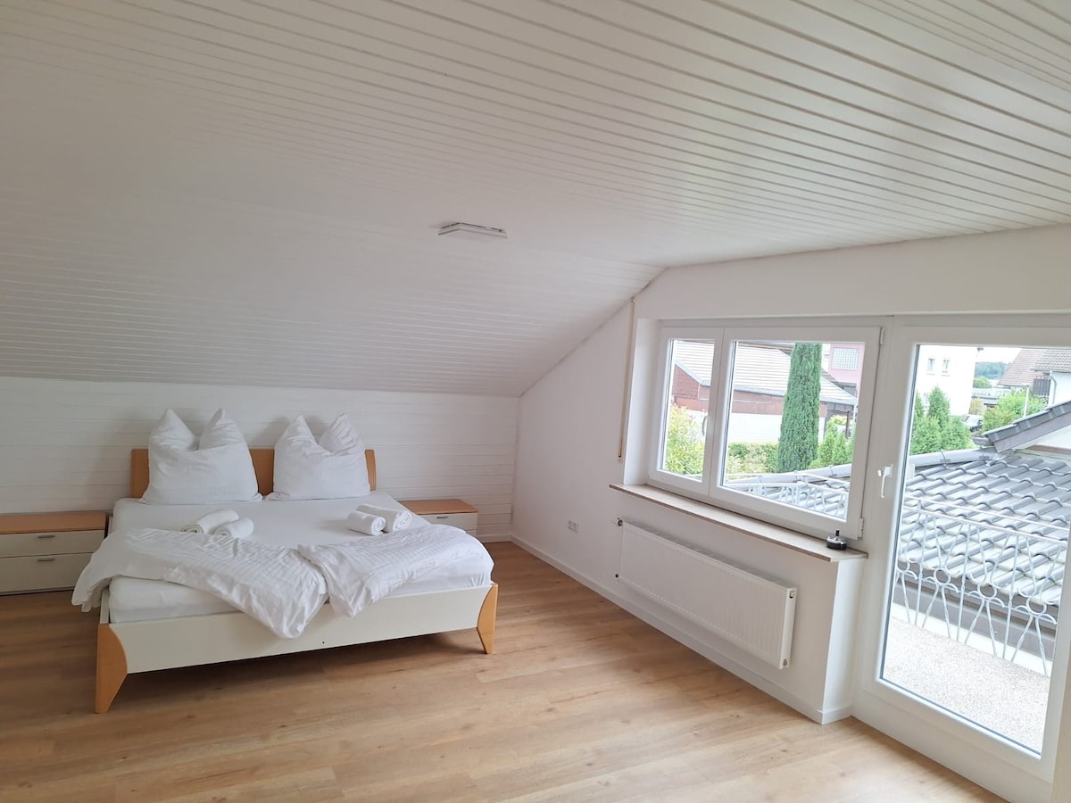 Cozy Apartment in the attic with separate entrance and stairwell, with clean bathroom, Tinykitchen and a balcony overlooking Lake Constance and the Swiss Alps. Enjoy your morning tea or coffee on the balcony and feel like you are on a retreat. Free use of comunity kitchen with full equipment. Private parking in front of the house, also space for caravans and campers. We rent the room on a weeky basis.