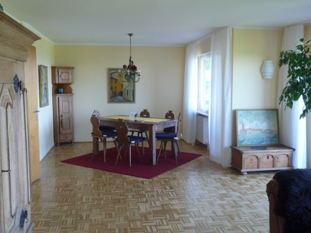 Dachwohnung mit Berg- und Seesicht! Gemütliche 1,5 Zimmerwohnung mit Küche und Tageslichtbad, ruhig im Drei-Familienhaus einer Sackgasse gelegen. 10 Gehminuten bis zur historischen Altstadt von Tettnang, 10 Fahrminuten an See, Messe und nach Friedrichshafen, 60 Minuten bis in die Berge, Spazieren und Joggen durch Obst- und Hopfenanlagen direkt hinterm Haus.
