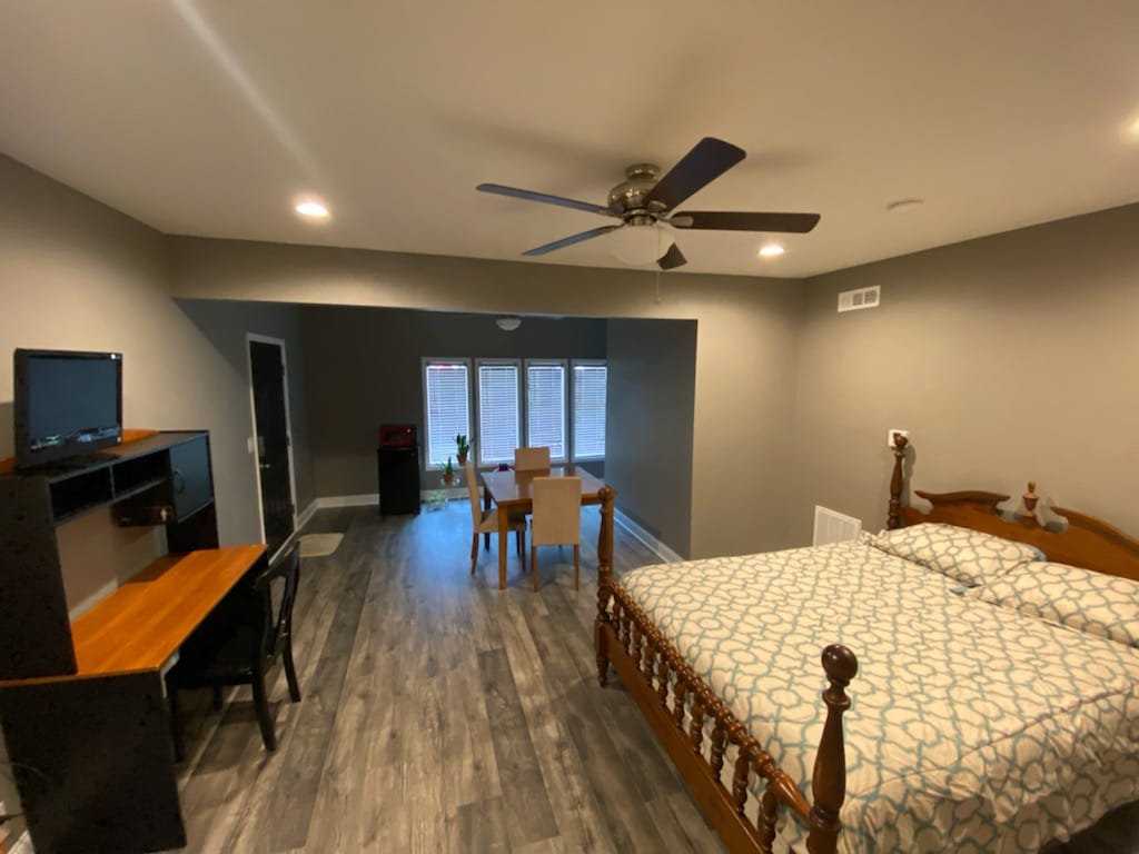 This is a newly renovated spacious private apartment above our home’s garage with a private entrance. The apartment has 1 bedroom with a queen-size bed and closet, a full bathroom with tub/shower, a kitchenette, and a living room. An additional twin-sized blow-up mattress is available upon request. Only smaller pets under 45 pounds are allowed with small added fee.