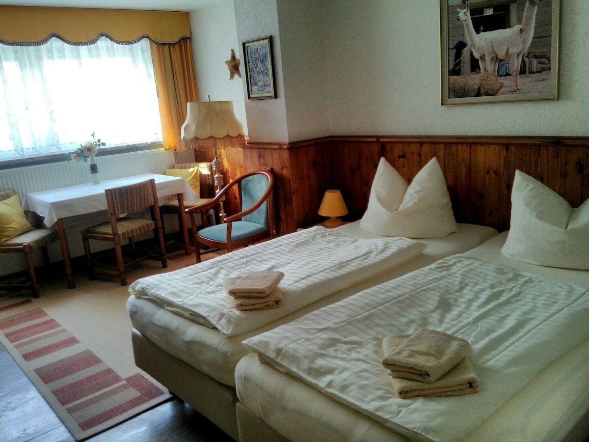 The rye chamber offers a relaxing break for 2 people in our barn suite. The large cottage garden and the terraces can be used to relax and unwind. Breakfast can also be booked on request .The 25 m² double room can accommodate 2 people (max. 2 adults). It has 1 bedroom,1 bathroom & 1st floor (accessible via a staircase)