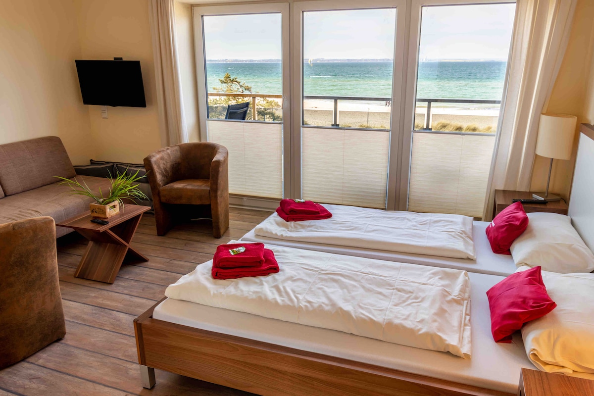Unsere Ocean View Appartements sind ca. 30 qm groß und wie folgt ausgestattet: 1 Wohn-/Schlafzimmer mit Couchgarnitur oder Sesseln, Doppeltbett, Duschbad (Fön ist vorhanden), TV, Kaffeemaschine, Tresor und möbliertem Balkon mit traumhaftem und freiem Blick über den Ostseestrand . Die Angebotenen Zustellbetten eignen sich für Kinder zwischen 4 und 16 Jahren. In den Ocean View Zimmern sind keine Kleinkinder unter 4 Jahren gestattet. Ebenfalls ist die komplette 1. Etage Haustierfrei.