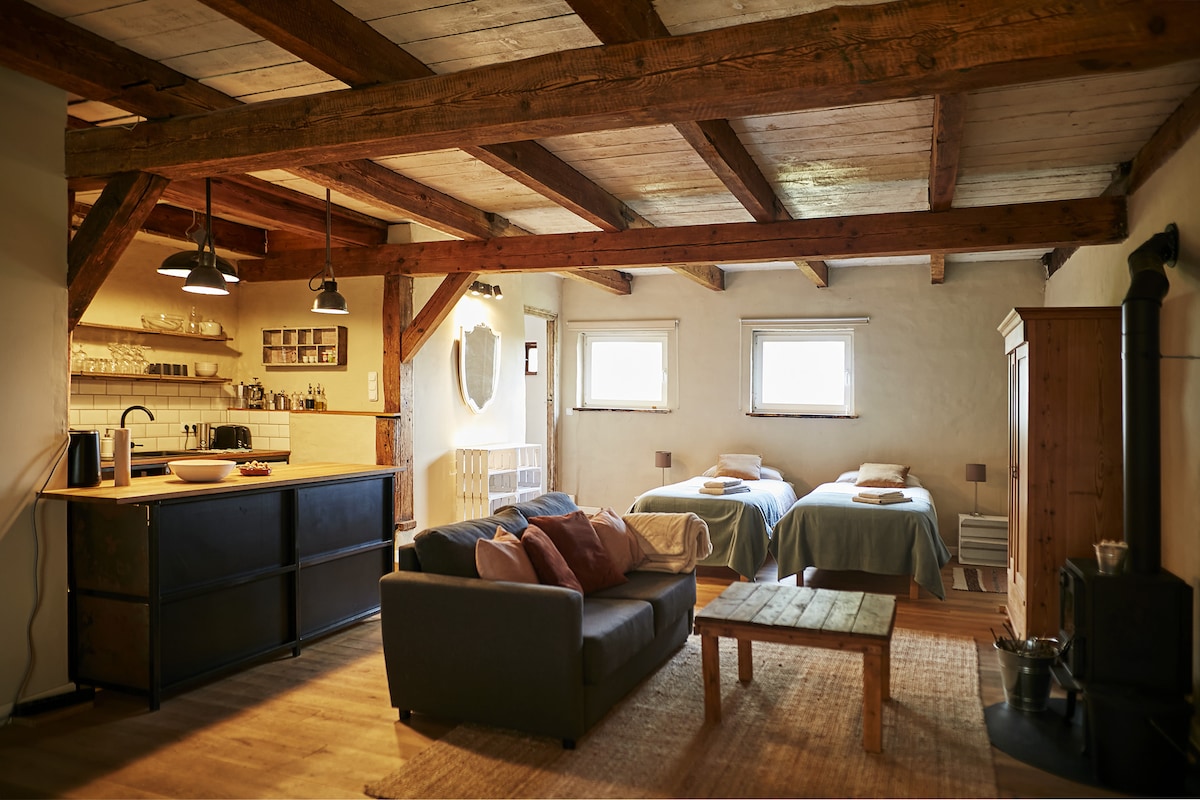 Das Gästezimmer liegt im hinteren Seitenflügel des Altstadthauses in einer ruhigen Gasse. Im unteren Bereich des offenen Studios lädt ein (Schlaf-)Sofa zum Verweilen ein, eine Küchenzeile bietet Raum zum Genießen kleiner Mahlzeiten. Eine schmale Wendeltreppe führt in den Schlafbereich unterm Dach, in dem ein kuscheliges Doppelbett zur Verfügung steht, direkt dahinter gelangt man in das kleine, moderne Bad. Eine gemütliche Alkove über dem Bad bietet eine weitere Schlafmöglichkeit für Sportliche.