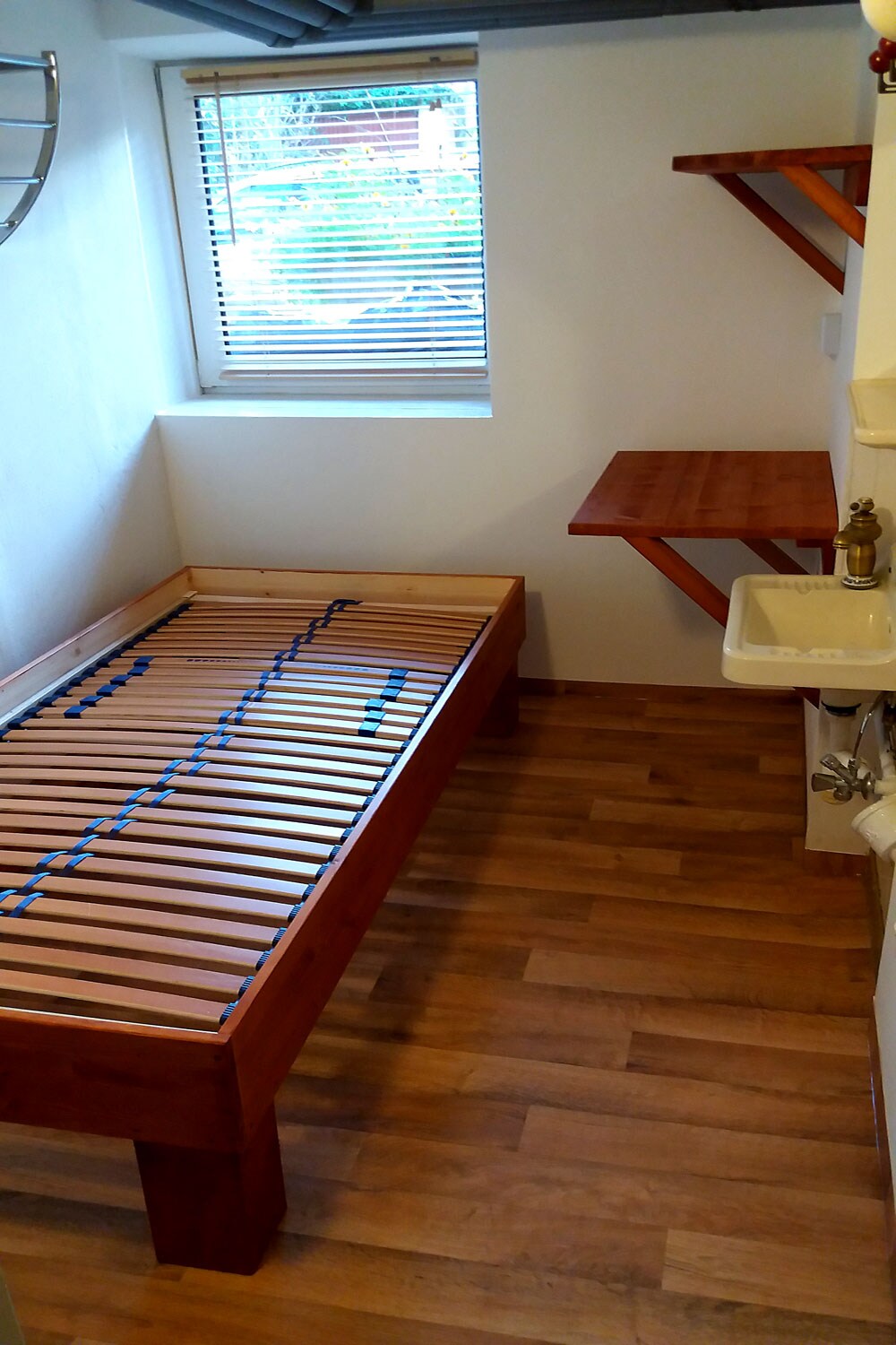 Das Ferienzimmer (7qm) verfügt über einen separaten Eingang und besticht durch kuschlige Gemütlichkeit. Trotz der sehr kleinen Größe ist alles vorhanden, was man zum Entspannen braucht. Das Sofa mit Einzelbettgröße und kann auf die doppelte Breite ausgezogen werden. Dem gegenüber befindet sich eine Essecke, ein Flachbild-TV und der Zugang zum Tageslicht-Bad mit Dusche. Zusätzlich befindet sich im Bad die kleine Miniküche. Eine Elektroherdplatte, sowie Töpfe, Geschirr und Besteck sind vorhanden.