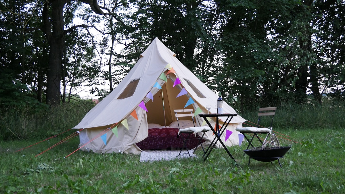 Zelten im wilden Staudengarten und mit unvergleichlichem Blick in die Ferne. Zwischen vom Wind geschaukelten Gräsern und umgeben von zahlreichen Seen steht auf unserem 5000 qm großen Grundstück, welches wie eine Insel inmitten der Felder liegt, ein ca. 30 qm großes Zelt aus grober Baumwolle. Drei Bäume bieten Schatten und Schutz im Rücken, während die Zeltöffnung nach Westen den Blick auf den Sonnenuntergang in die Ferne schweifen lässt und Kranich und Milan vorüber ziehen.
