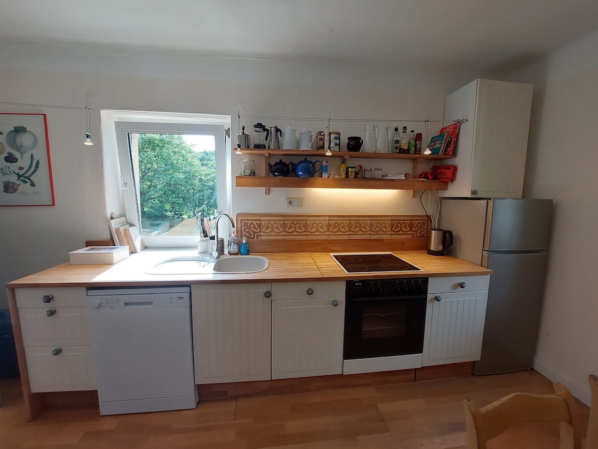 Die sonnige, Licht durchflutete Wohnung ″Scheunendiele″ liegt in einer ausgebauten Fachwerkscheune mit eigenem Garten und Sonnenterrasse. Geräumige 60 qm, Wohnzimmer mit offener, voll ausgestatteter Küche, bieten Raum für 2- 4 Personen. Der Essbereich ausgestattet für bis zu 4 Personen liegt neben dem Wohnbereich mit Couch und Sesseln und zusätzlicher Lese Ecke beim Kamin. Die beiden Schlafzimmer befinden sich in der oberen Etage, mit Blick in den wunderschönen Garten.