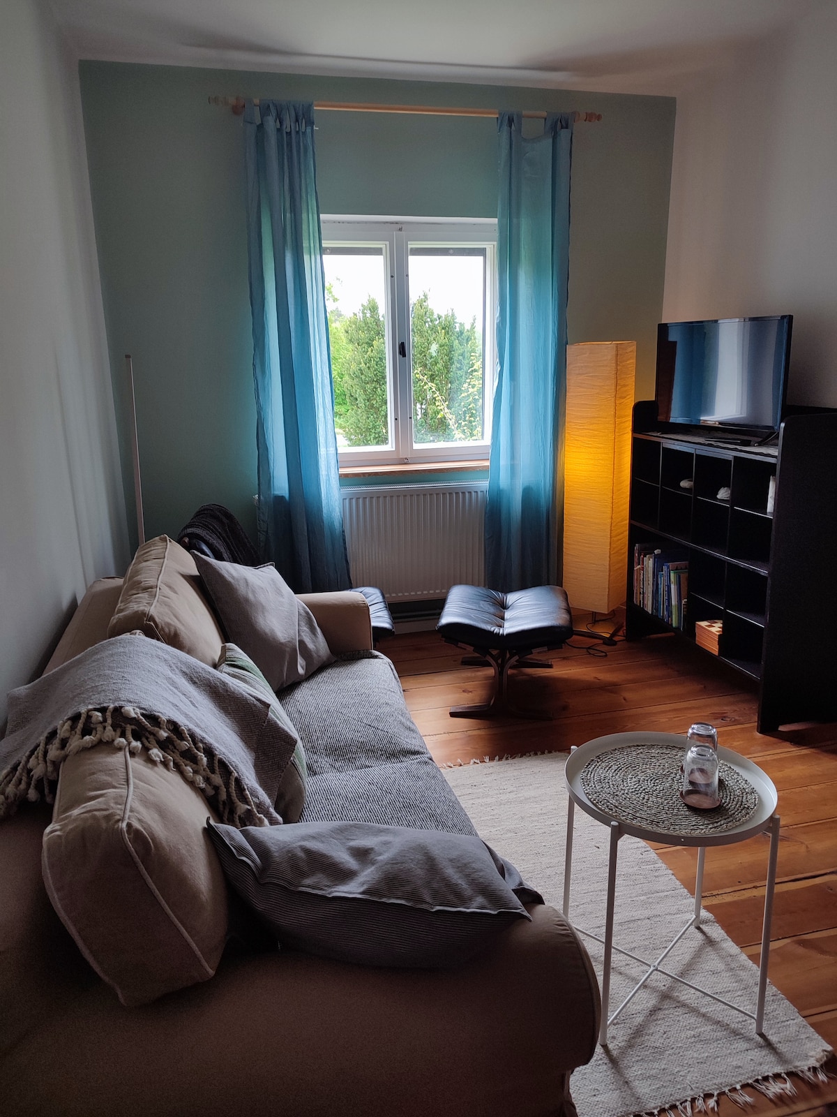 Ein schönes, gemütliches Zimmer wartet auf dich. Dort findest du Bett, Couch, Kleiderschrank, Fernseher und eine kleine Sitzecke. Die Zudecke ist in Übergröße. Eine Küche gibt es nicht. Für kleine Mahlzeiten ist entsprechendes Geschirr vorhanden sowie Wasserkocher, Kühlschrank und eine Kochplatte für dich. Das Bad mit Dusche nutzt du allein. Auf dem Flur könnten wir uns selten begegnen. Ein Rad kann ich dir auch gern anbieten. Ggf. kannst du am Vormittag schon einchecken.