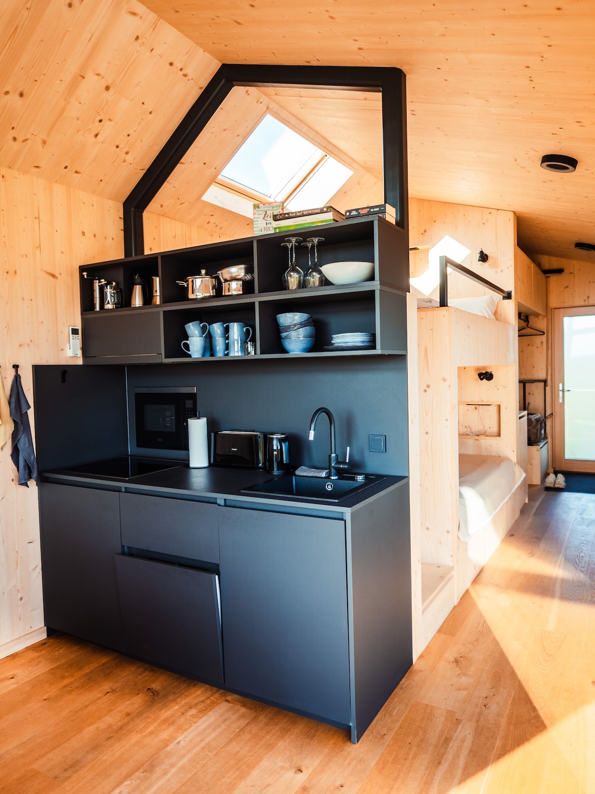 ... look out of your bed onto the water, enjoy the peace and quiet and listen to the rustle of the beech forest, experience bike tours directly on the water and enjoy nature. A beautiful, modern and rustic, low-energy half-timbered house with thatched roof, Moroccan tiles, oak floorboards and clay plaster walls awaits you. For activities there is a beautiful large garden with a forest swing, free steam sauna, outdoor shower and tub, a standup paddle, a paddle boat and 4 bicycles.