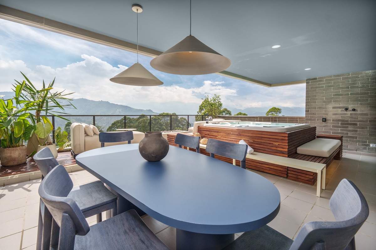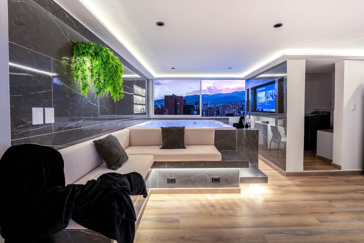 Welcome to our luxurious 26th-floor penthouse, where elegance, comfort, and unparalleled views come together in the heart of Provenza. This stunning space is designed for those who seek the finest in city living. Our open-concept design seamlessly integrates the kitchen, living room, and balcony into one expansive area, perfect for relaxation. A private balcony with a luxurious soaking tub offering the most spectacular views of Medellín’s skyline and the lush surrounding mountains.