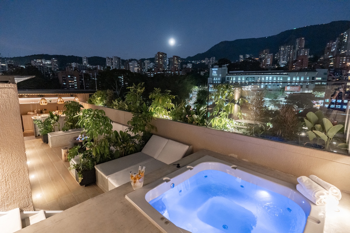 Steps from top restaurants, rooftop bars and nightlife. Private terrace with outdoor jacuzzi, mountain views, gas fireplace and BBQ. Fully equipped modern kitchen with dishwasher, oven and stove. Master bedroom with King bed, second bedroom with Queen. Perfect for a high-end stay in the heart of Medellín.
