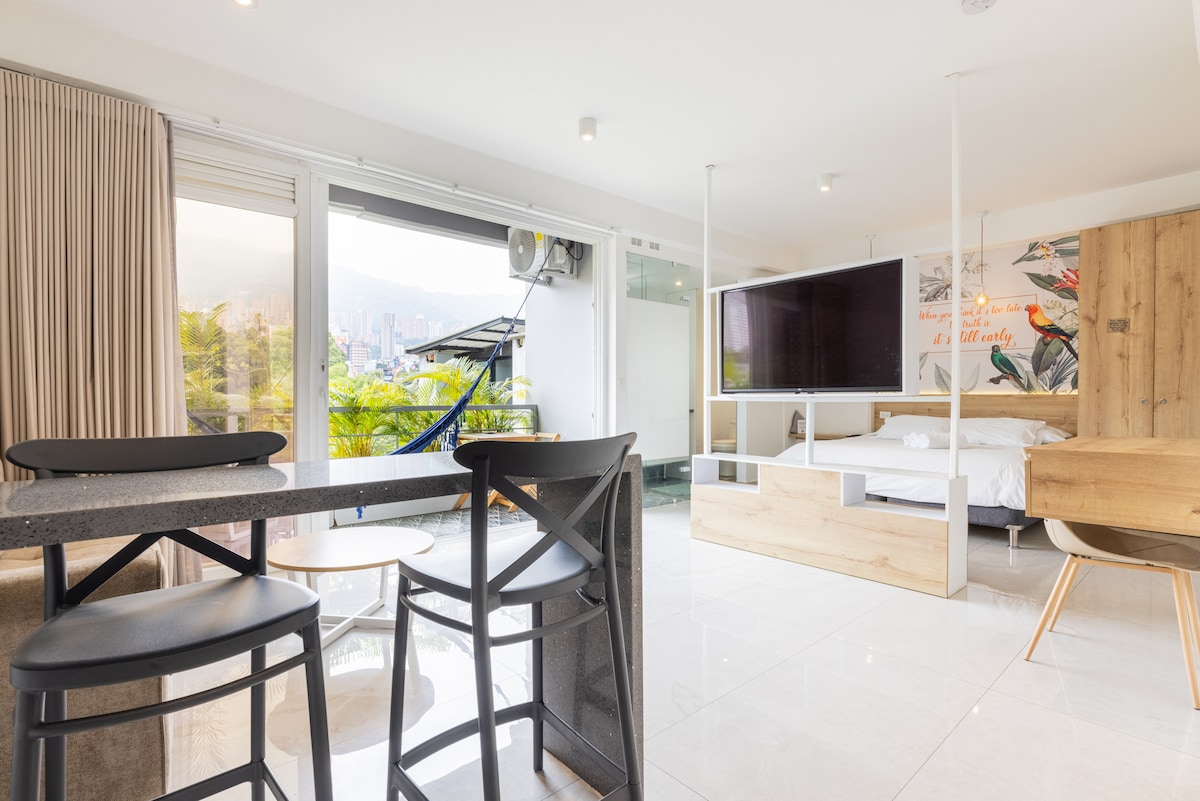 Modern, cozy and well-located in Laureles neighborhood, Mauria Local House is a studio that will charm you during your stay in Medellín. With a lovely design, local plants, panoramic view from the terrace and every detail a world digital traveller needs! *This apartment is located in front of Av. 33, which might be a bit lively in the weekends. We have sound-proof double windows*