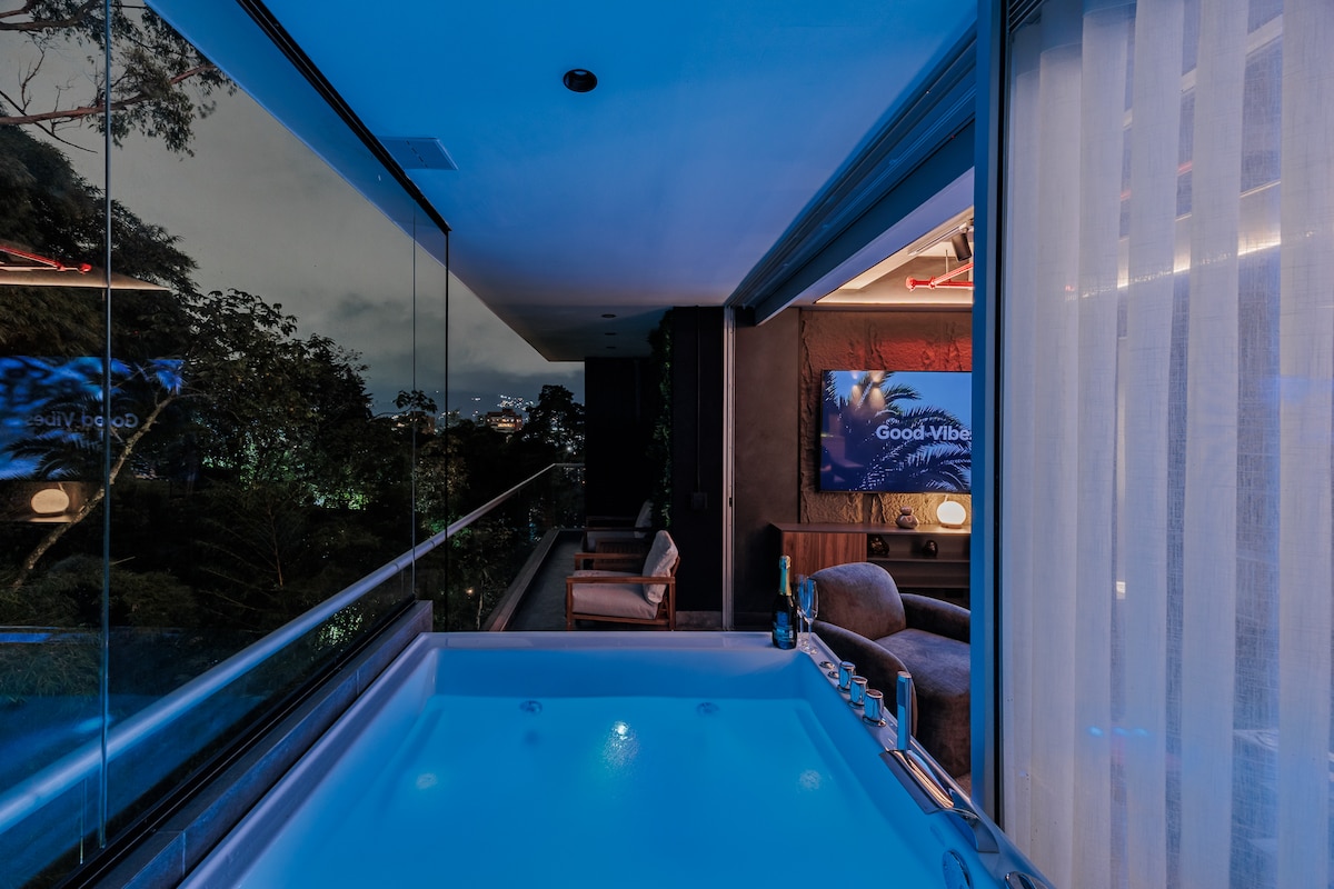 Experience Medellín from above in this luxury 1 BD apartment on the 24th floor, with premium finishes, skyline views, and total comfort. Enjoy a private Hot Tub, spacious living area, fully equipped kitchen and 5 stars amenities. -Private Hot bath tub -AC -Blackout remote control -High Speed Wi‑Fi/800MBs -Pool+Jacuzzi+Turkish bath -FREE in-unit washer/dryer -On-site restaurant & SPA -Full gym 24/7 -Workspace -FREE co‑working space -24/7 lobby & security -No Airbnb fees