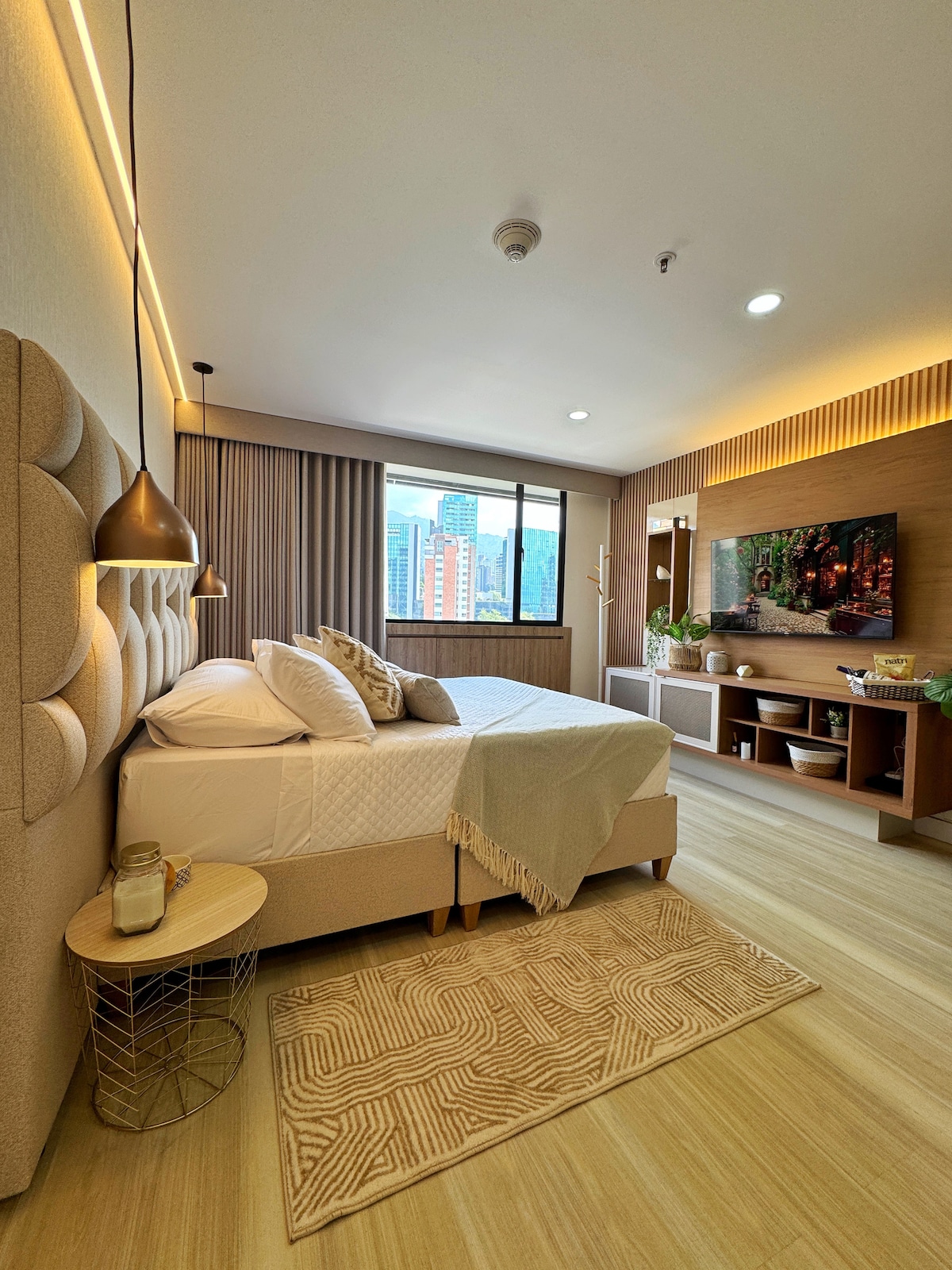 Luxury 70m² loft on the 9th floor of the iconic Energy Living. Open our floor-to-ceiling windows to transform your entire living space into an airy, open-air retreat with Medellin’s best skyline views. Features a King-size bed, two 80" TVs, and a sleek modern design. Enjoy a rooftop infinity pool, gym, and jacuzzi on the 22nd floor. Located 5 mins from Provenza and El Tesoro. Secure, quiet, and perfectly connected.