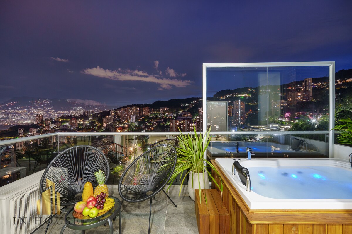 Great pool area on building´s terrace Jacuzzi, Steam and Gym Restaurant/Bar Lounge in lobby. Room service Balcony with Priv. Jacuzzi /Queen size bed AC Separate Bedroom-Living Room Comfort and spacious in contemporary design. Complete kitchen Great view of city and mountains. Close to Provenza best bars/restaurants in city. Clothes washer and gas dryer in apartment. Energy Living iconic building in Medellin Private jacuzzi in Balcony 11th Floor 1.000 Sq. Feet Fast Wifi 24/7 check-in