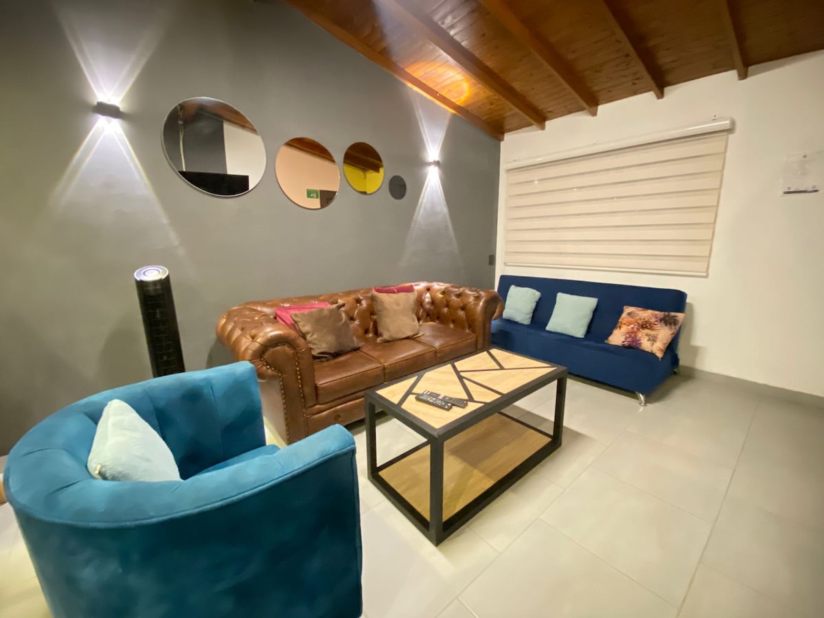 A charm of luxe 3-floor gem in Medelin North.Unique in the area,Amenities for ultimate relaxation.Delight in the Patio rooftop with BBQ, kitchen,Priv. Jacuzzi, and speakers. Each bedroom w/double beds, private bathrooms,closets, TV. Enjoy the luxe of common areas, lavish dining and living room, Cozy TV room. Sofa, beds & pillows of high comfort. Prime location,close to Metro stations,supermarkets, restaurants, and vibrant nightlife, 20 Min from Poblado. Unwind without worry about traffic. 3 A/Cs