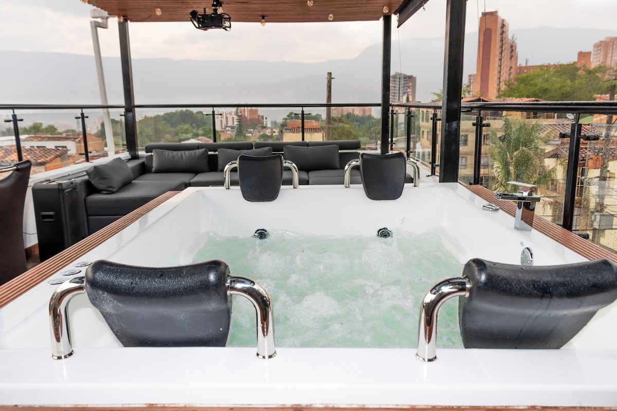 Welcome This luxury 5-bedroom home features A/C, Smart TVs, and private bathrooms in every room. Located less than 15 minutes from El Poblado and Provenza, with affordable Uber rides for just $2.5 USD, you’ll be close to the city’s best nightlife. Enjoy a private rooftop, available 24/7, complete with a jacuzzi, outdoor cinema, BBQ, and stunning views of Medellín. If you’re looking for more than just a place to sleep, this is it. Enjoy the perfect experience! Friends are welcome with free entry