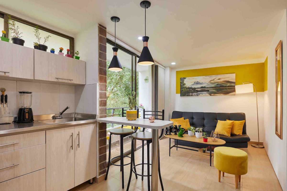 ☀ Welcome@☀ Our beautiful studio apartment located in El Poblado, offers you comfort and an excellent location, in an exclusive sector of the city, surrounded by nature. We have a high speed Wifi of 170 mbps. The accommodation is located 5 minutes from Av. Poblado and 15 minutes from the metro on foot, in addition to a large park, supermarkets, shopping centers and magnificent restaurants in the area. Just two blocks away you will find a beautiful park ;)